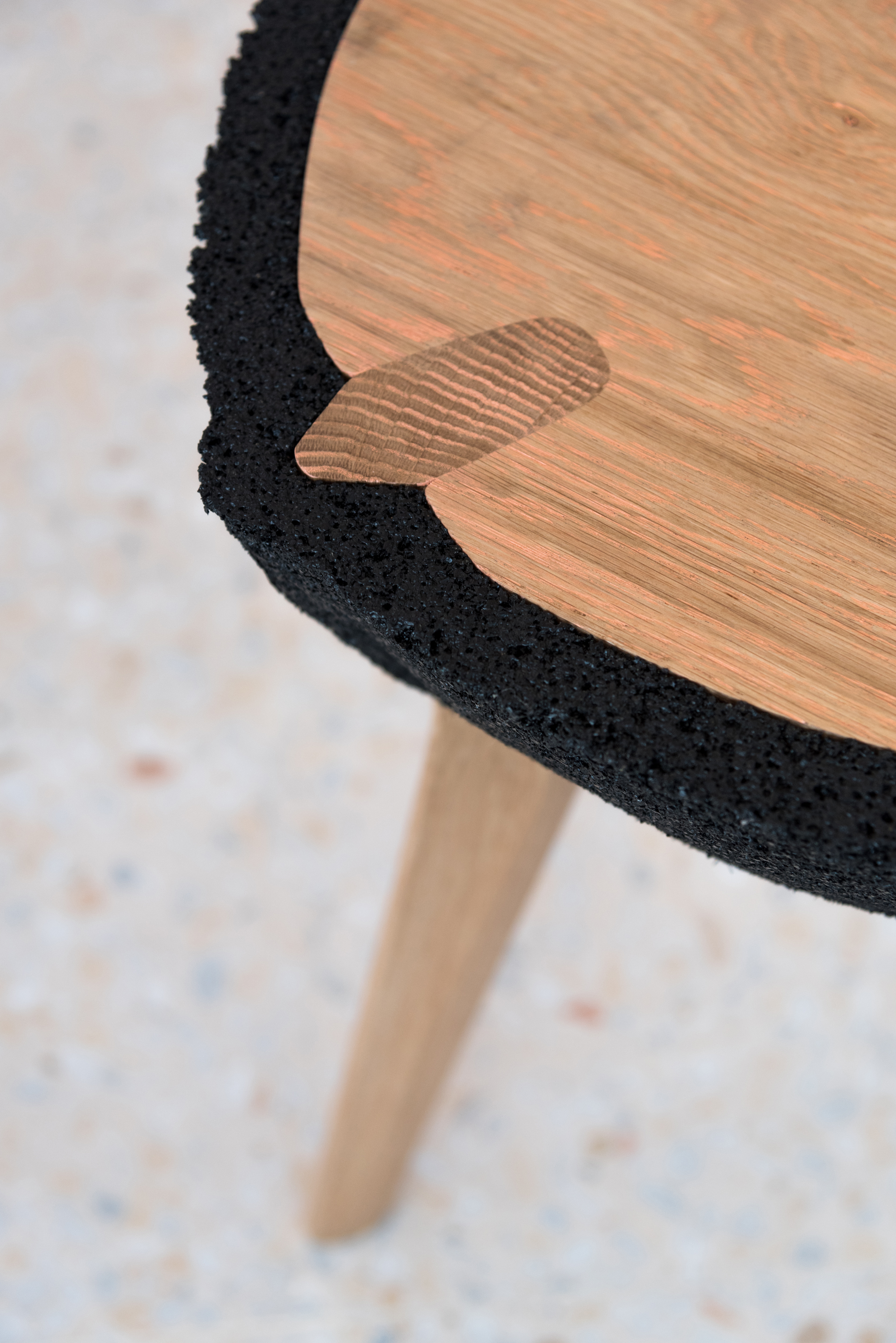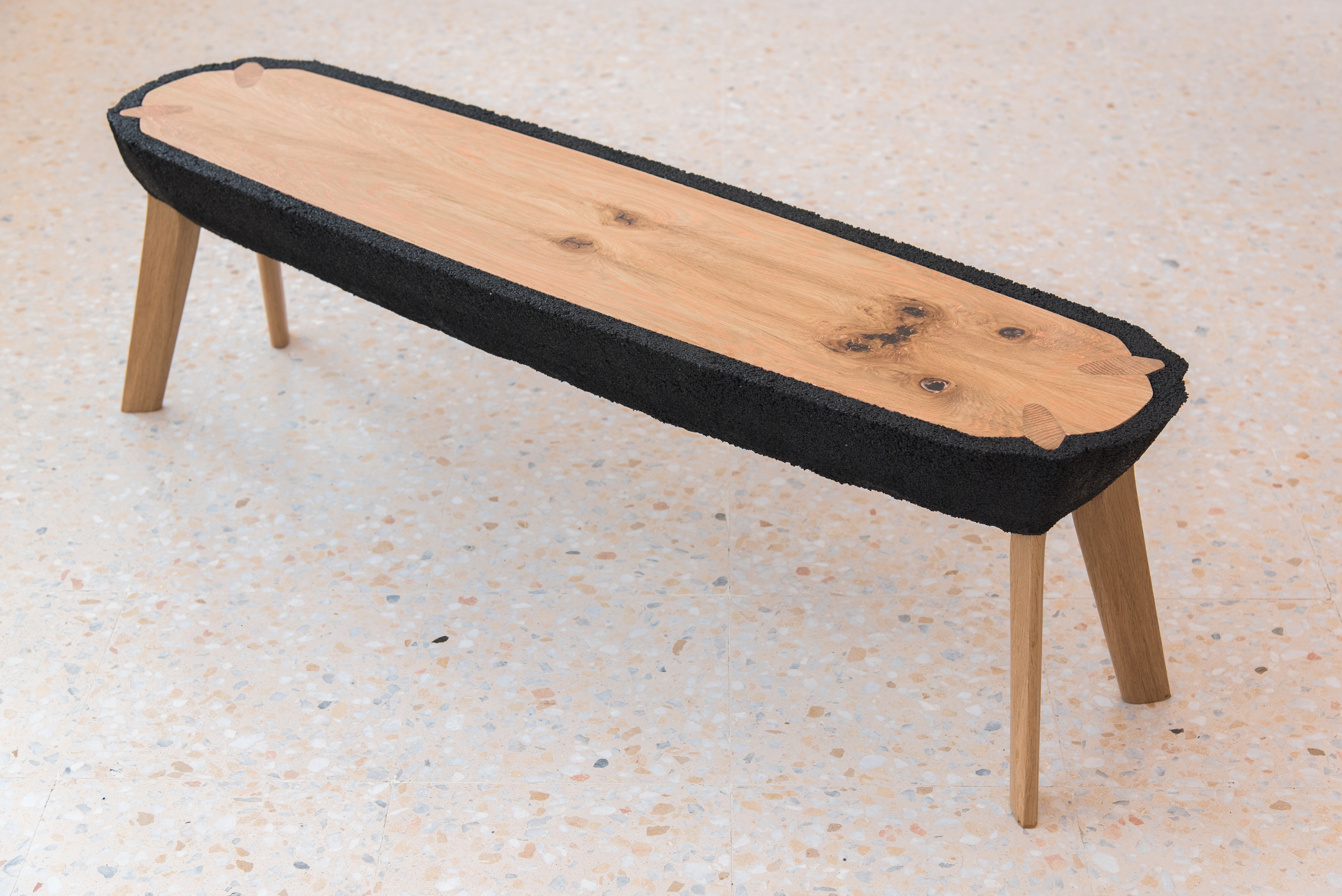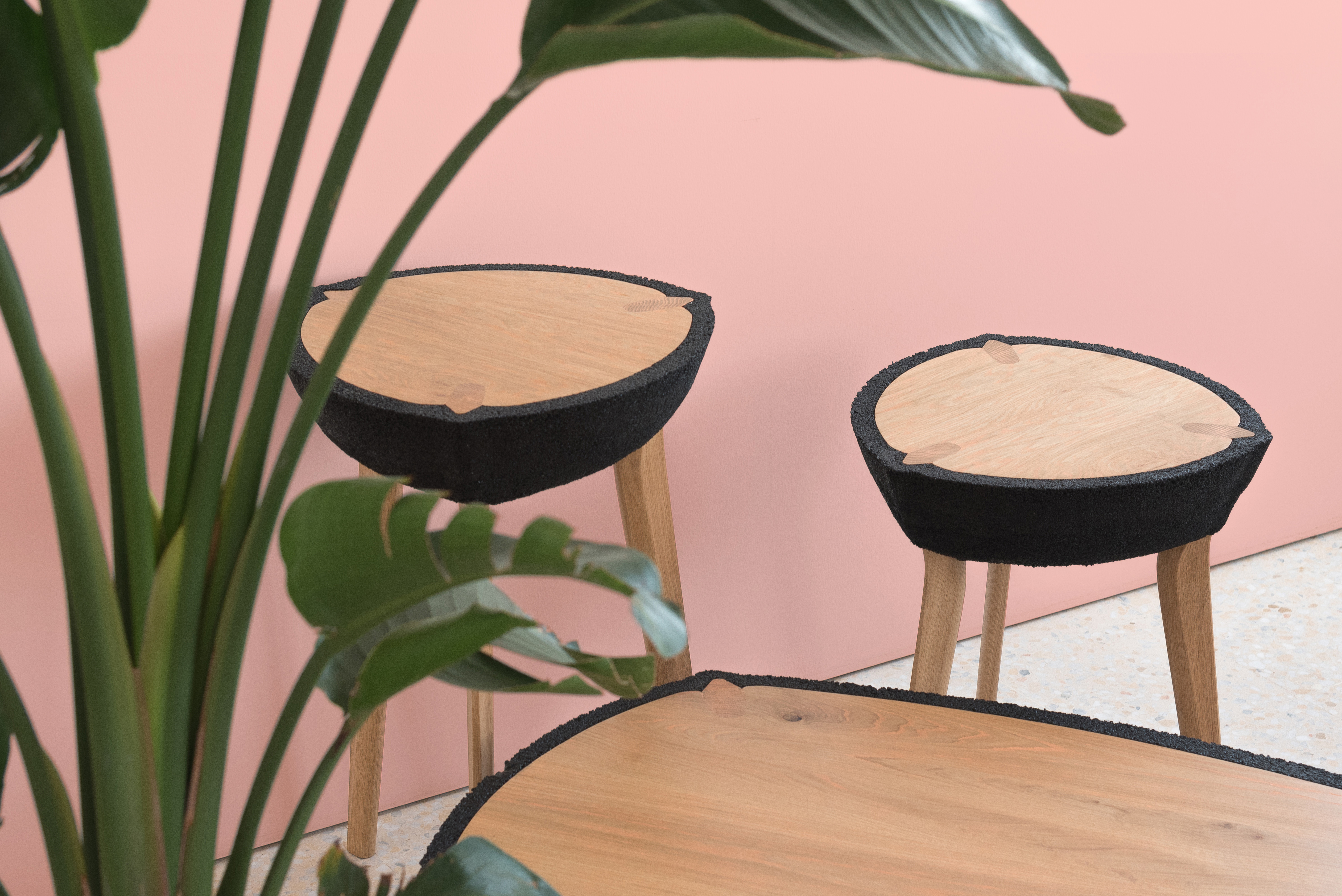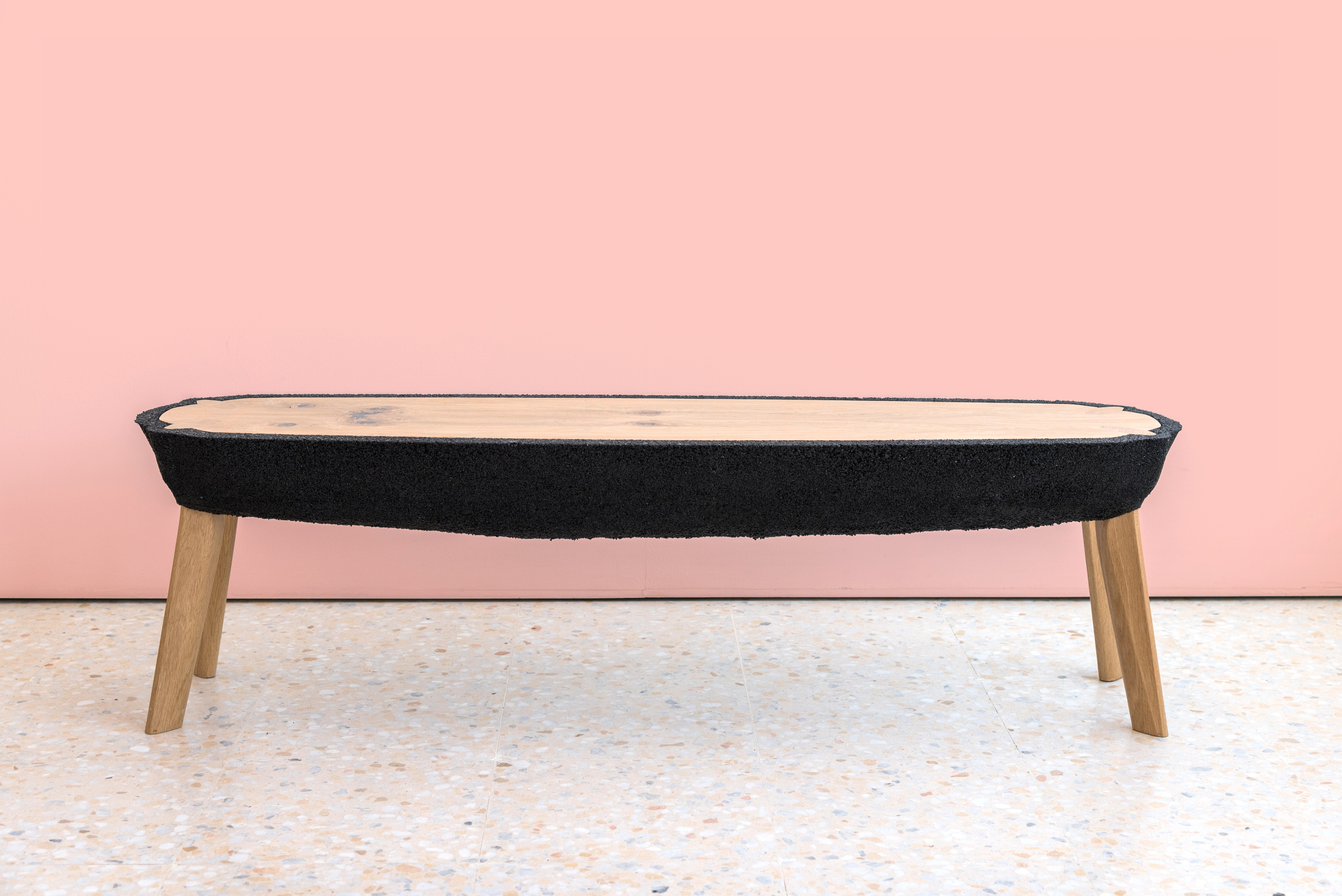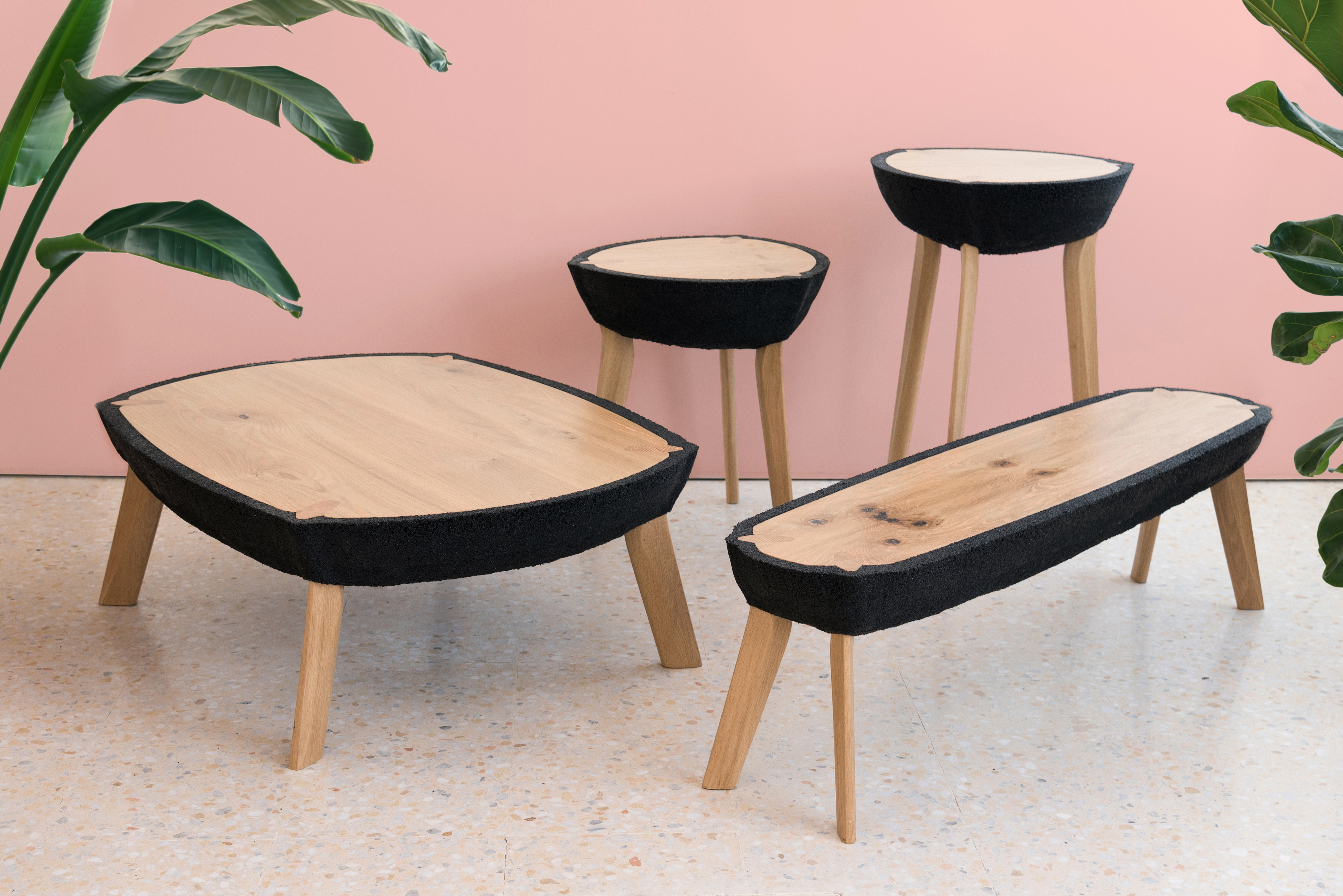 Embracing visual heaviness and experimenting with such an unconventional material as recycled rubber crumb led Kalo to create KALO’s Fikra Tables, a series of tables with bulbous rubber bodies that appear to have been sliced in half, revealing a solid white oak interior. The table tops are made of white oak panels and cerused with pink paint, picking up hues from their surroundings. The hovering black masses are delicately balanced by contrasting thin legs that pierce through to the ground. A cross-section of the legs can be seen from the table top, nestled between the tabletop surface and the rubber exterior. These pieces were commissioned by Fikra Campus, a design studio, co-working space, café, design library, and experimental gallery based in Sharjah, United Arab Emirates. Each of the four tables was designed for a specific use and location within the space.