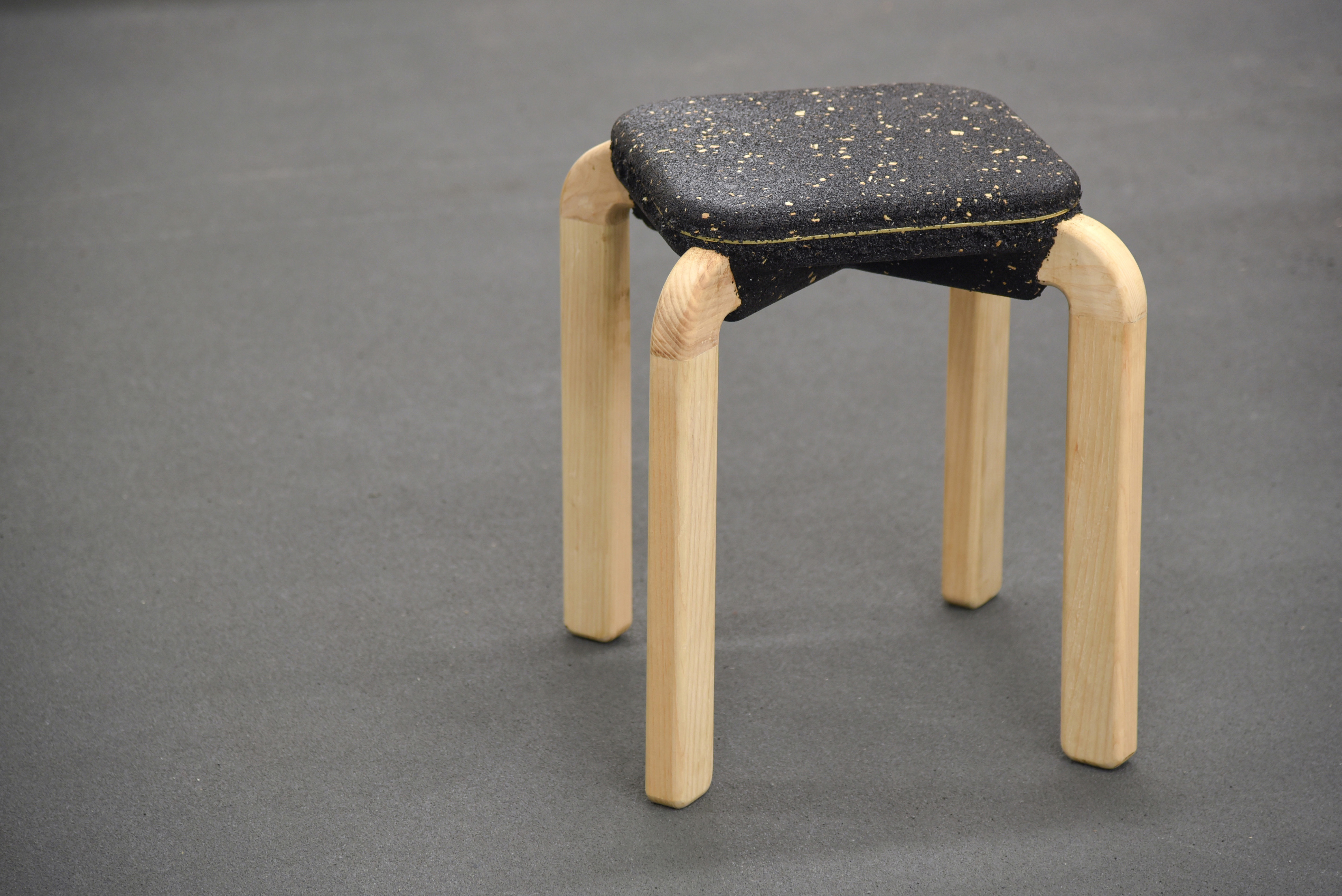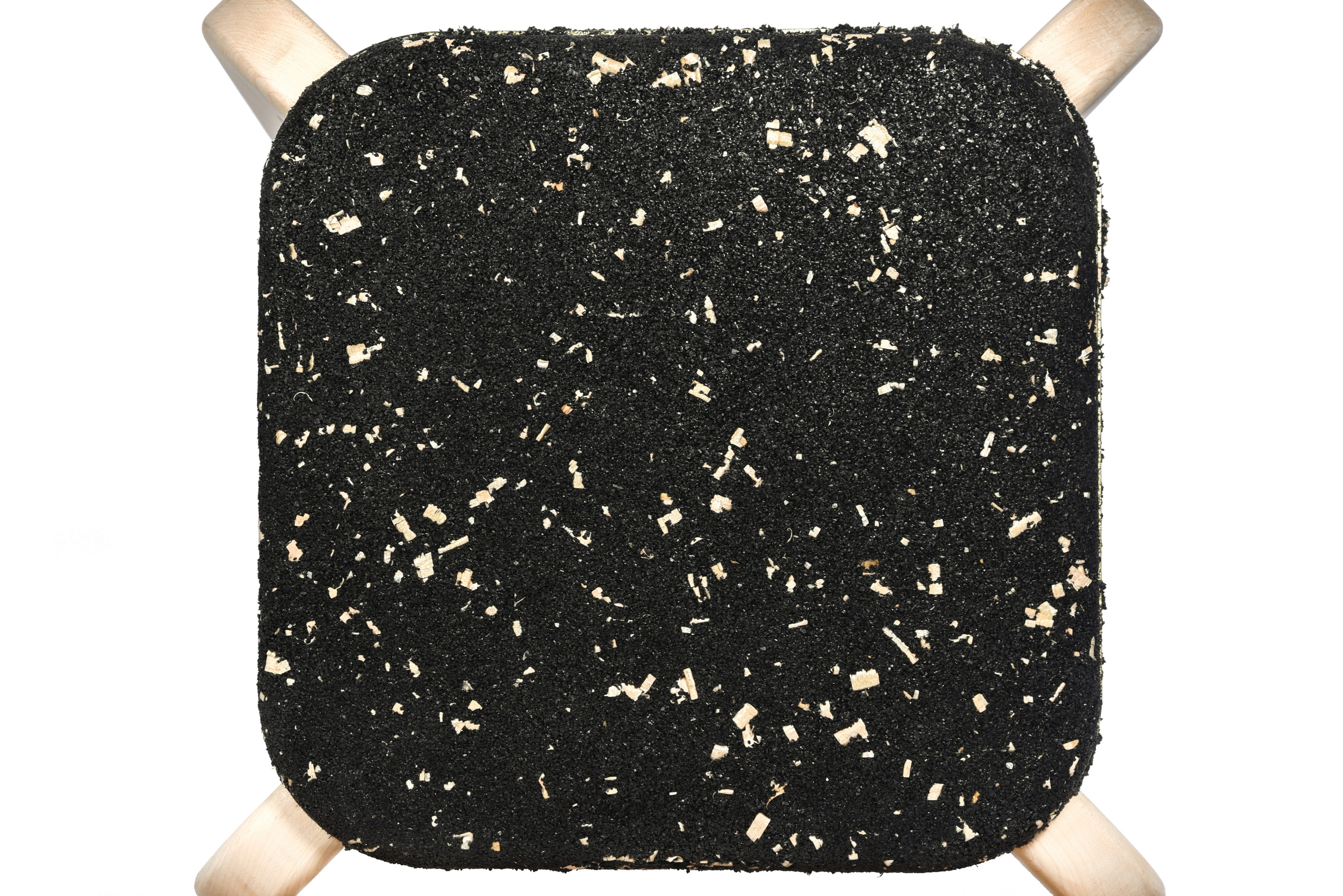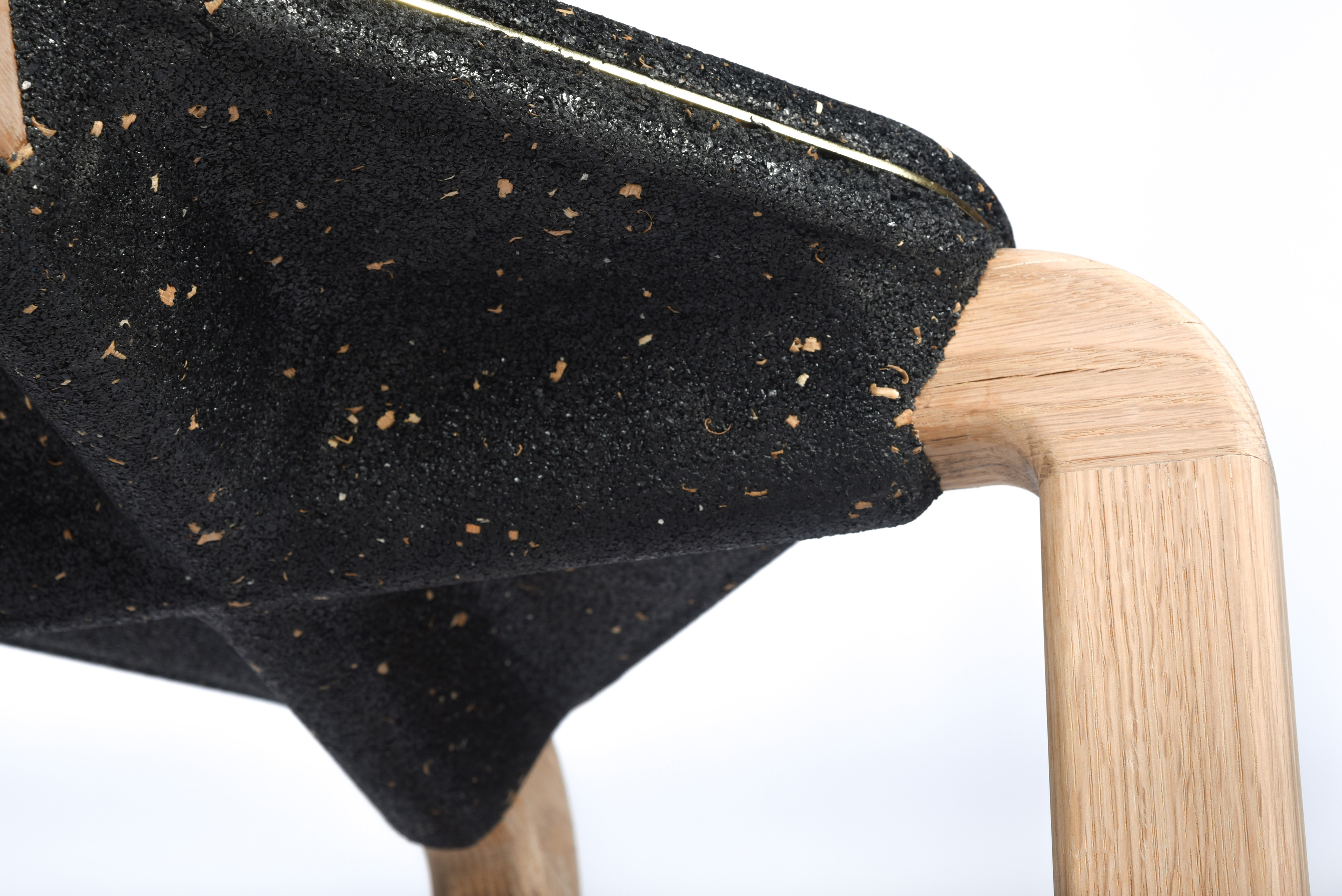 Ammar Kalo was one of two teams of designers commissioned by BEEAH Group, a Middle East’s leading waste management company, to explore the potential of using locally recycled rubber crumbs in a furniture collection. His approach involved employing an industrial technique similar to BEEAH Group’s process for making rubber pavement tiles. This collaboration resulted in the Macaron Seats, crafted partly from recycled rubber crumbs sourced from used tyres. Each Macaron seat is created by pressing a two-part mould onto a pre-existing wooden frame. The design explores the softness, compressibility, and bonding capabilities of rubber, integrating it with other recycled materials like wood chips to redefine the relationship between soft and hard surfaces in a chair. Kalo describes the Macaron concept as a design that is simple yet rich in detail. The speckled seat surface is created by adding wood chips from the leg fabrication, with a brass ribbon embedded in the centre for refinement. The seats feature smooth, chamfered surfaces and rounded edges, with a fuzzy centre. The legs extend from the rubber mass, folding down and leaving an X-shaped imprint on the underside, as if the rubber has stretched to accommodate them. Parting lines of the moulds are accentuated by overflow rubber, forming a solid rim that is removed after demoulding, resulting in a rough edge that contrasts with the smooth surface. A thin brass element enhances visual tension, while wood shavings mixed with the rubber crumb give the seats a speckled, organic appearance. Ammar Kalo’s work has garnered recognition through numerous international and local awards, including the Emerging Designer Award from Harper’s Bazaar Interiors. Additionally, Kalo serves as an associate professor and the Director of Labs at the College of Architecture, Art, and Design, American University of Sharjah. His research and teaching concentrate on robotic fabrication, furniture design, and design-build courses.