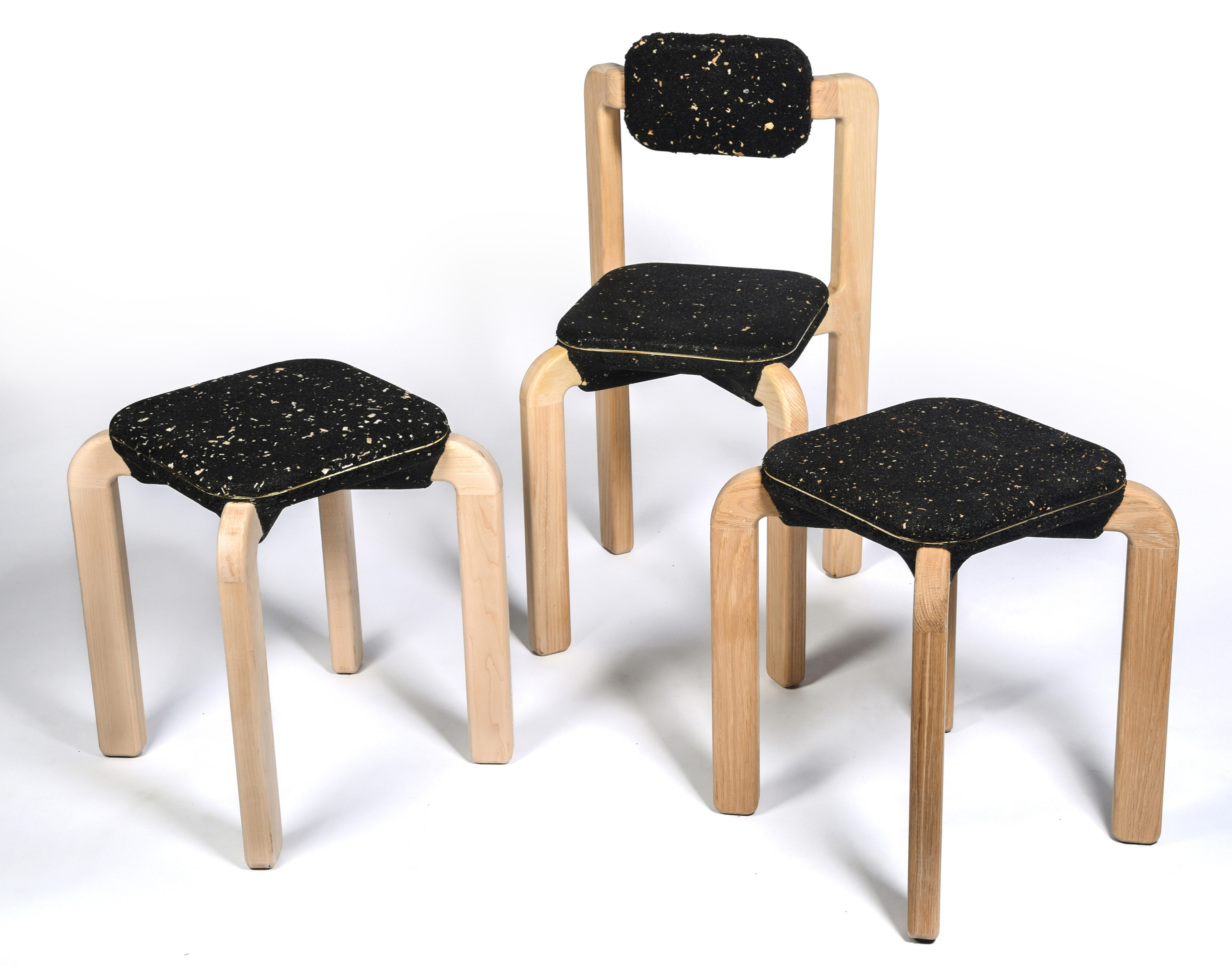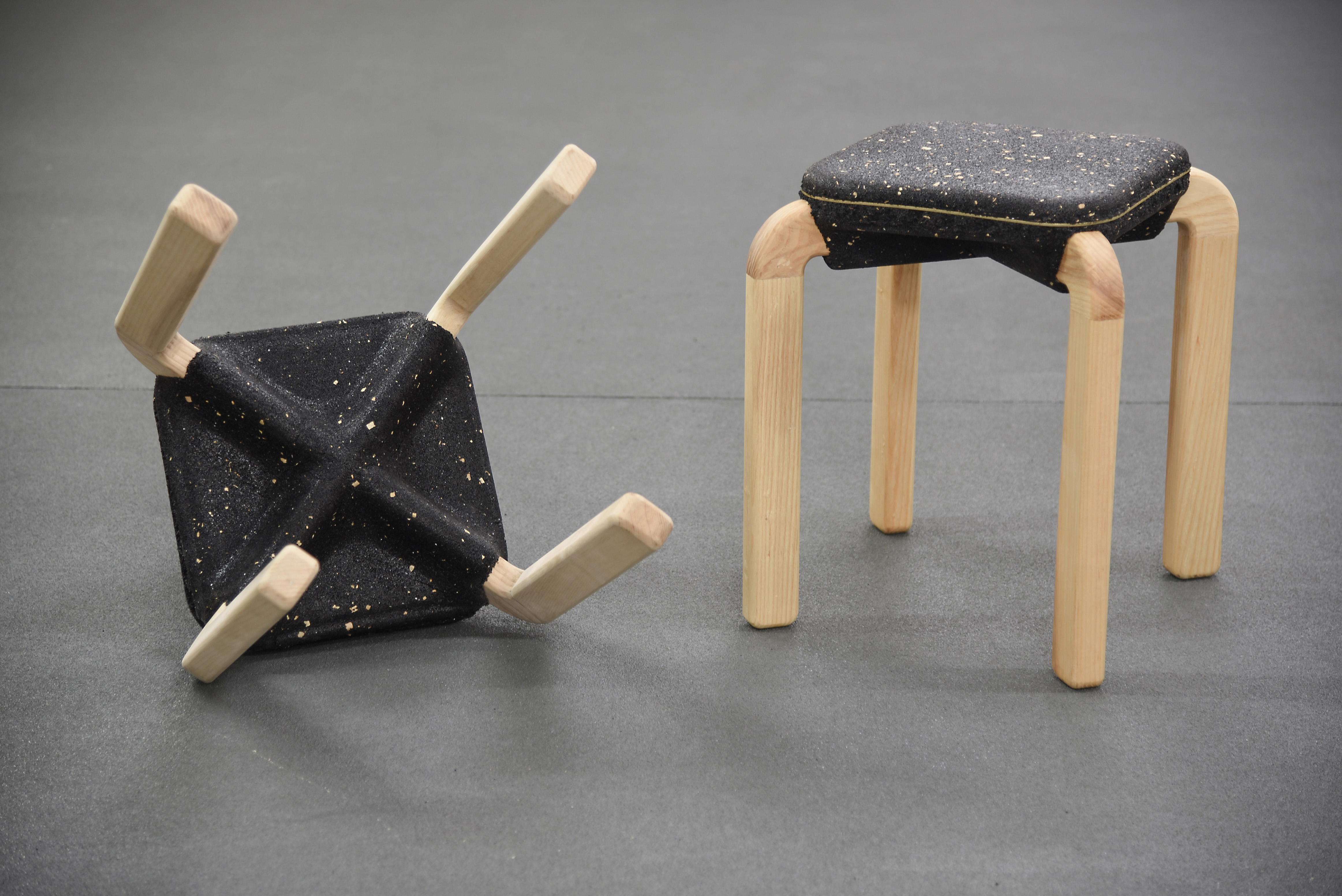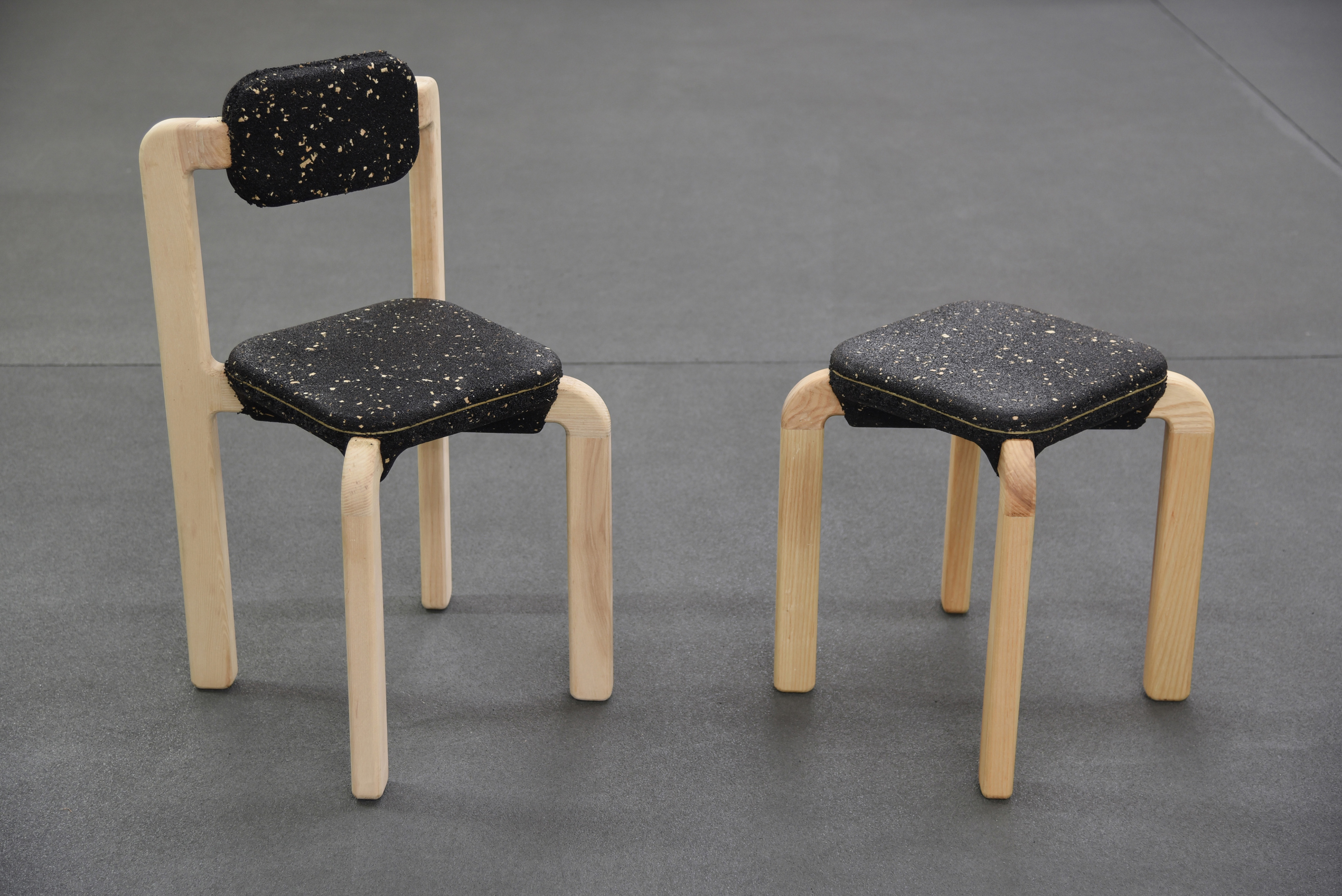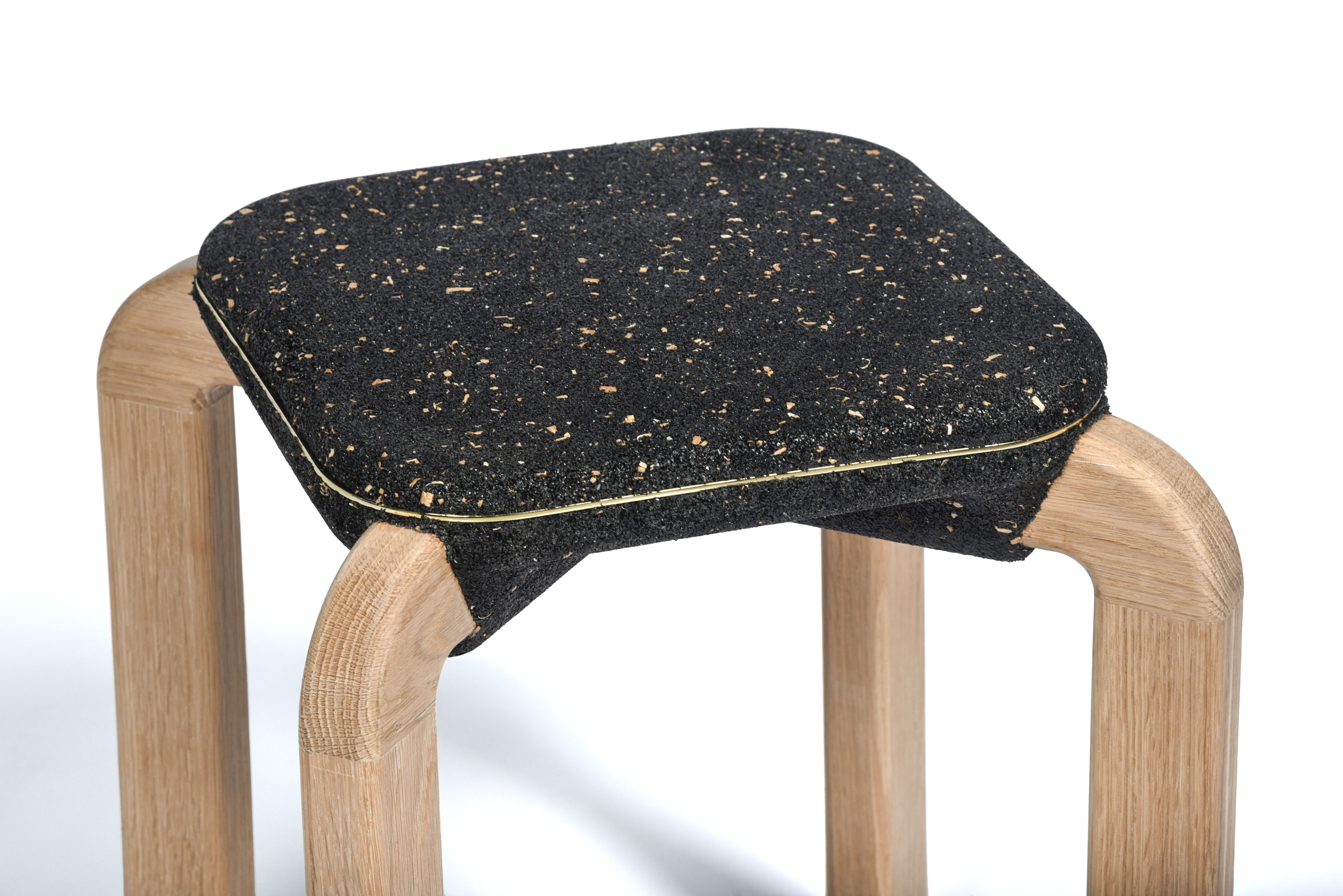 Ammar Kalo was one of two teams of designers commissioned by BEEAH Group, a Middle East’s leading waste management company, to explore the potential of using locally recycled rubber crumbs in a furniture collection. His approach involved employing an industrial technique similar to BEEAH Group’s process for making rubber pavement tiles. This collaboration resulted in the Macaron Seats, crafted partly from recycled rubber crumbs sourced from used tyres. Each Macaron seat is created by pressing a two-part mould onto a pre-existing wooden frame. The design explores the softness, compressibility, and bonding capabilities of rubber, integrating it with other recycled materials like wood chips to redefine the relationship between soft and hard surfaces in a chair. Kalo describes the Macaron concept as a design that is simple yet rich in detail. The speckled seat surface is created by adding wood chips from the leg fabrication, with a brass ribbon embedded in the centre for refinement. The seats feature smooth, chamfered surfaces and rounded edges, with a fuzzy centre. The legs extend from the rubber mass, folding down and leaving an X-shaped imprint on the underside, as if the rubber has stretched to accommodate them. Parting lines of the moulds are accentuated by overflow rubber, forming a solid rim that is removed after demoulding, resulting in a rough edge that contrasts with the smooth surface. A thin brass element enhances visual tension, while wood shavings mixed with the rubber crumb give the seats a speckled, organic appearance. Ammar Kalo’s work has garnered recognition through numerous international and local awards, including the Emerging Designer Award from Harper’s Bazaar Interiors. Additionally, Kalo serves as an associate professor and the Director of Labs at the College of Architecture, Art, and Design, American University of Sharjah. His research and teaching concentrate on robotic fabrication, furniture design, and design-build courses.
