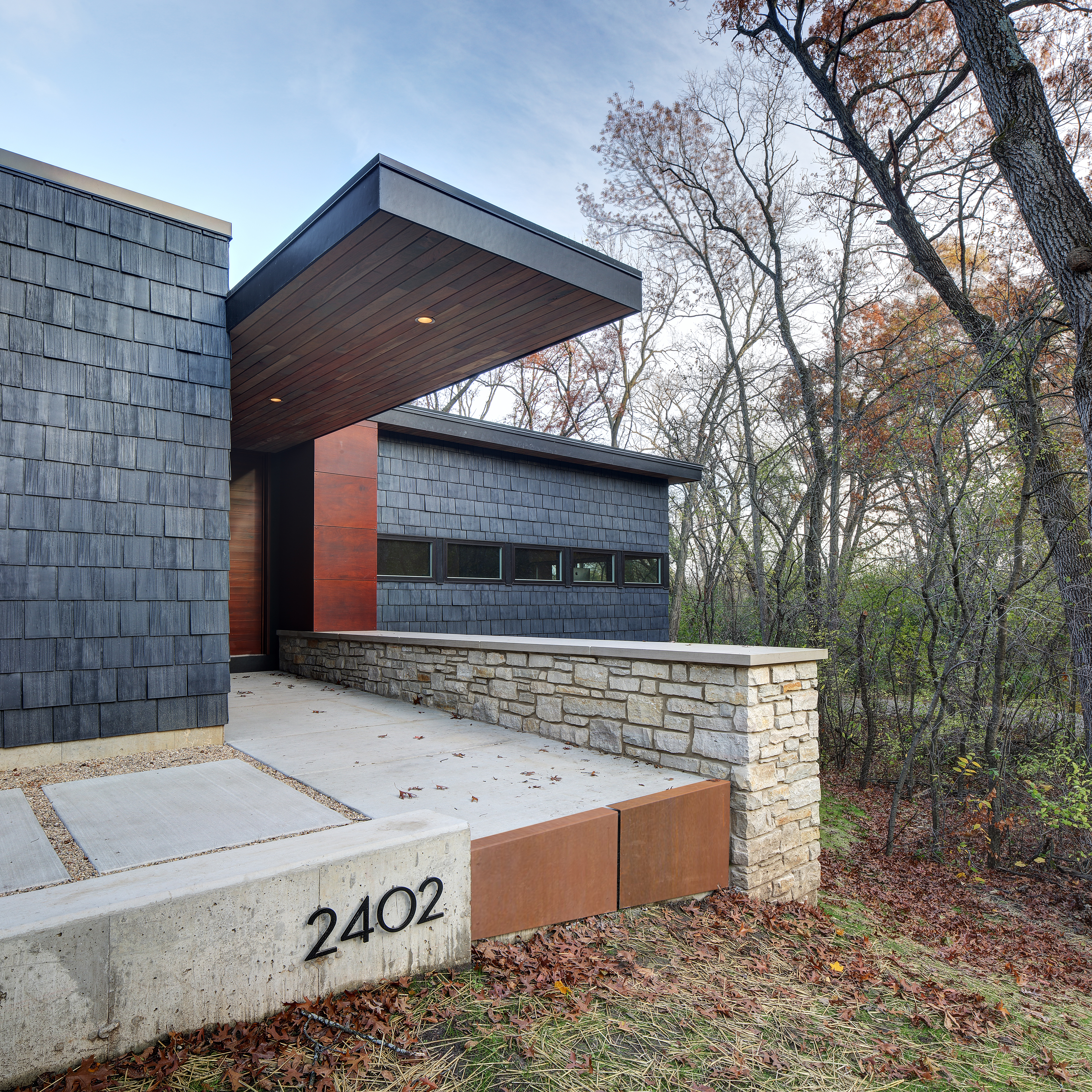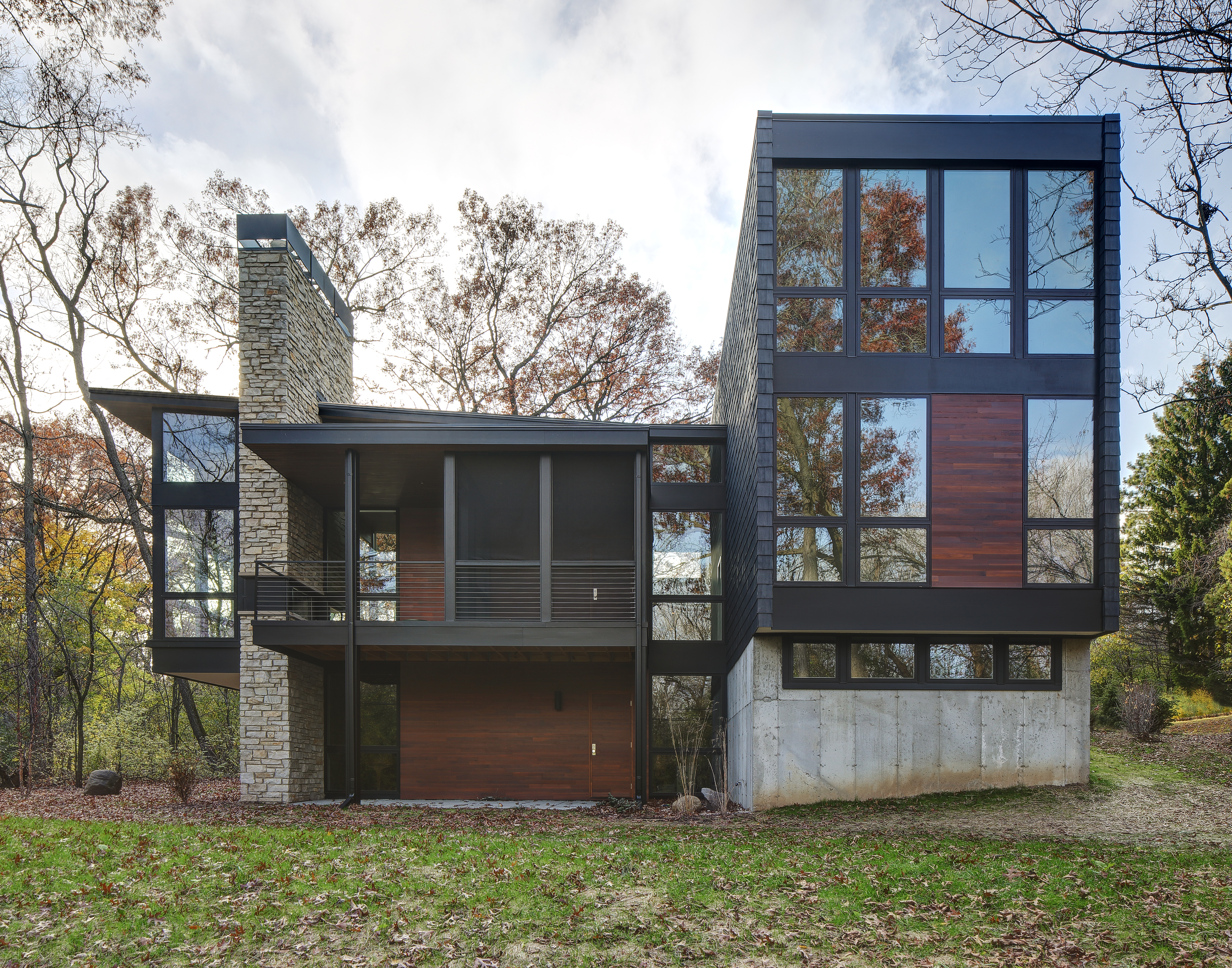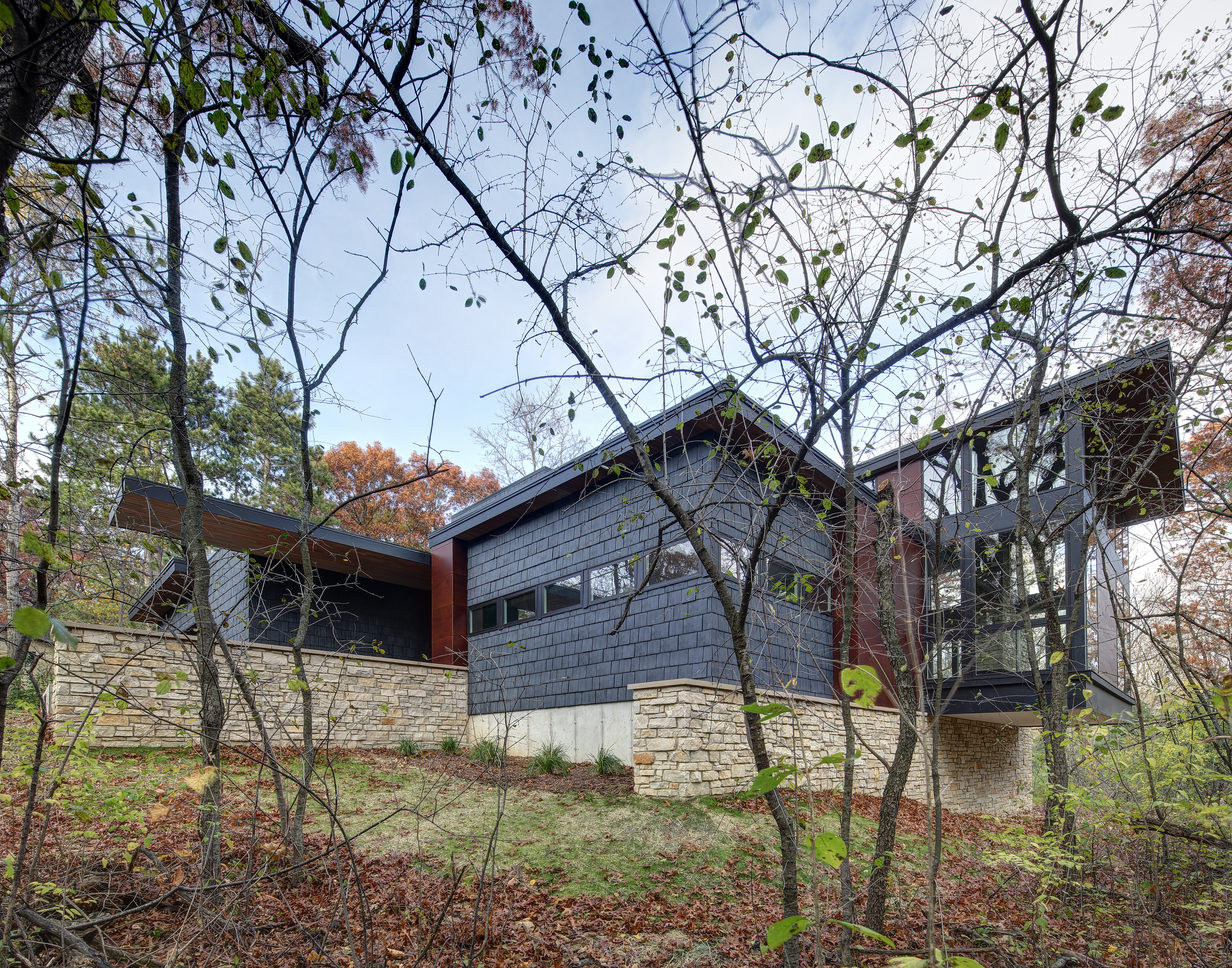 Arboretum House is a project where Bruns Architecture opted for a façade made from recycled materials, including recycled tyre rubber. They particularly valued the durability this roofing material offers when applied to vertical surfaces. In addition, the house emerges from wooded surroundings as a carefully curated array of structures that harmonise to form an architectural ecosystem. Nestled within the rich tapestry of the University of Wisconsin Arboretum neighborhood, the primary aim of the design was to craft a home that seamlessly integrates with the lush vegetation while leaving minimal footprint on the existing landscape.