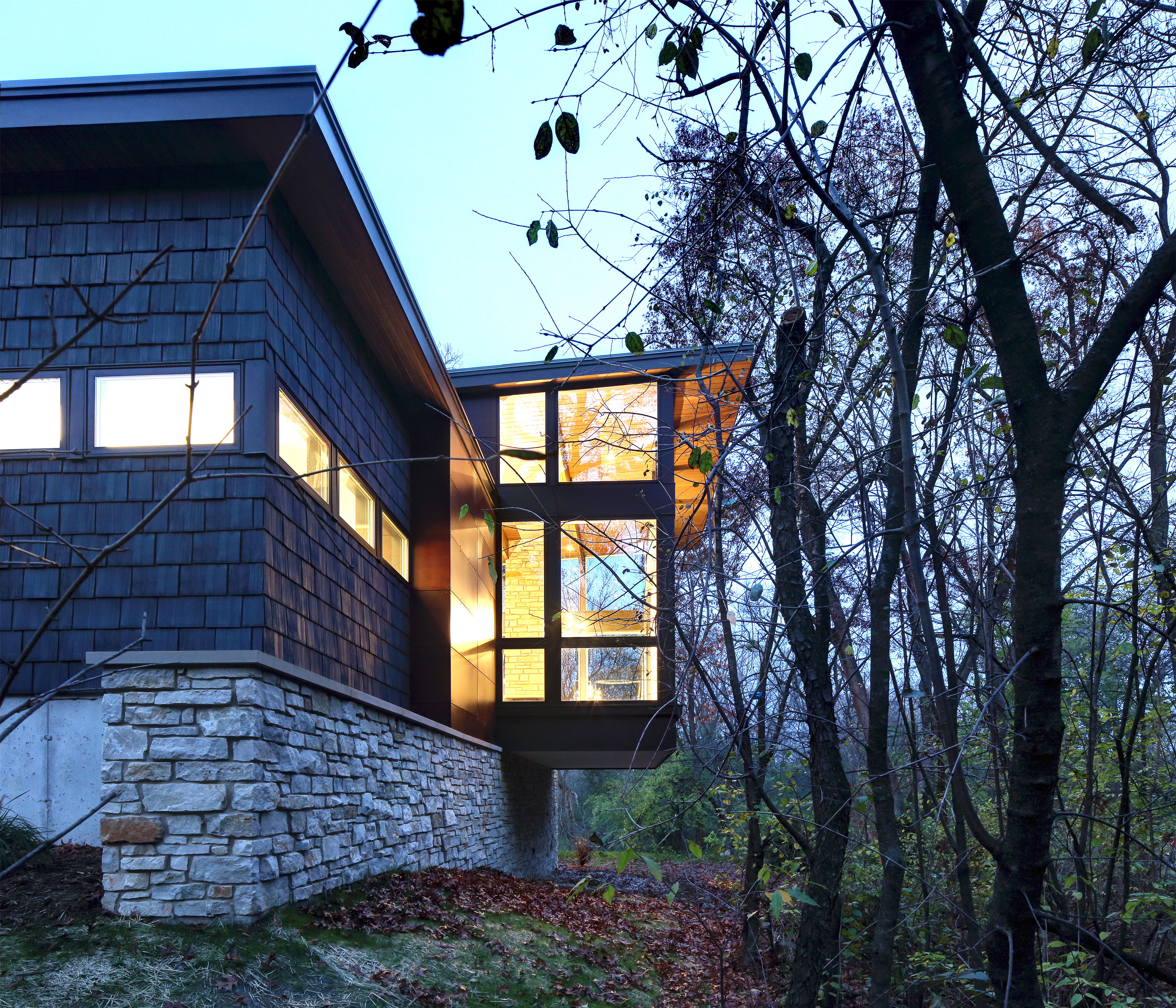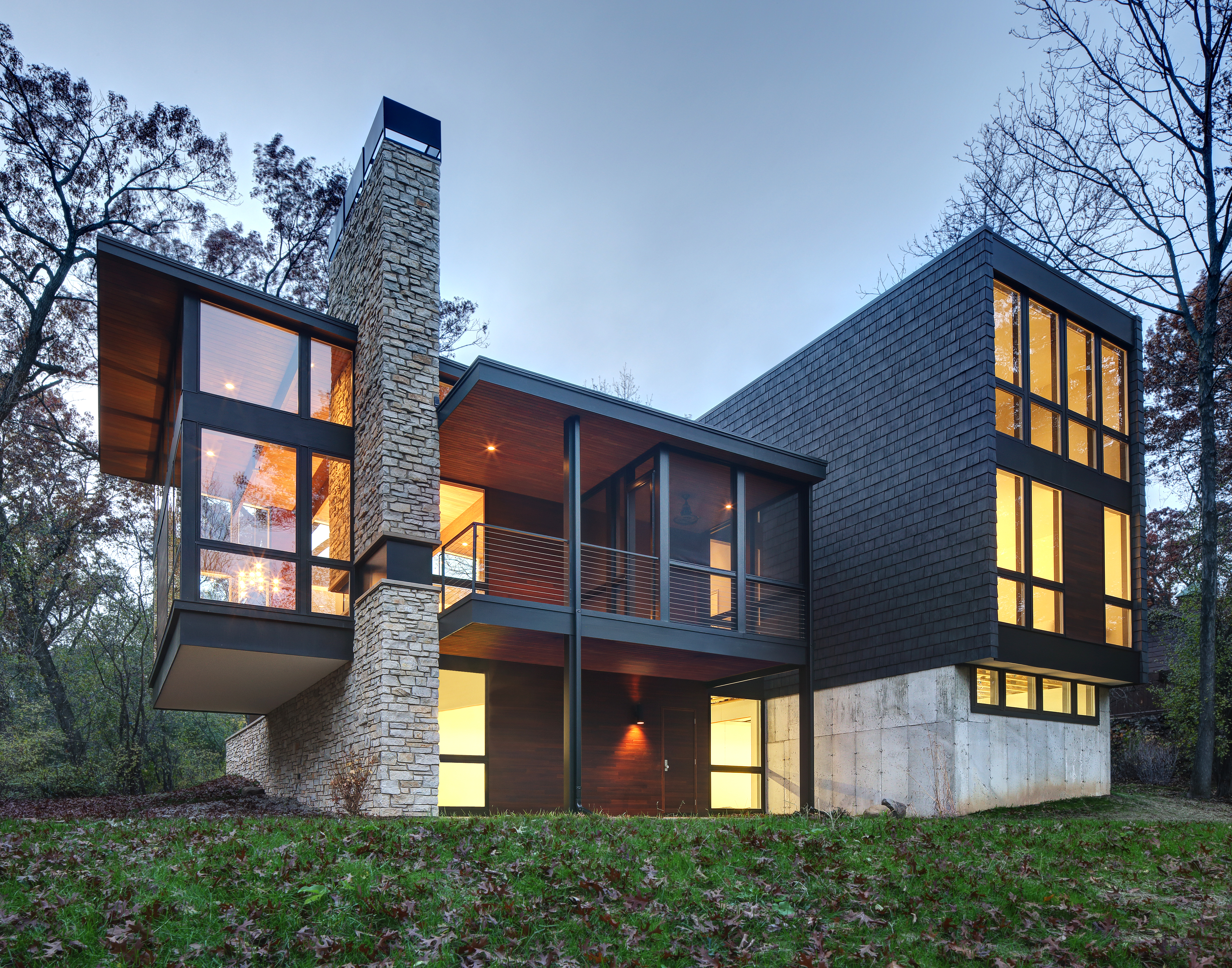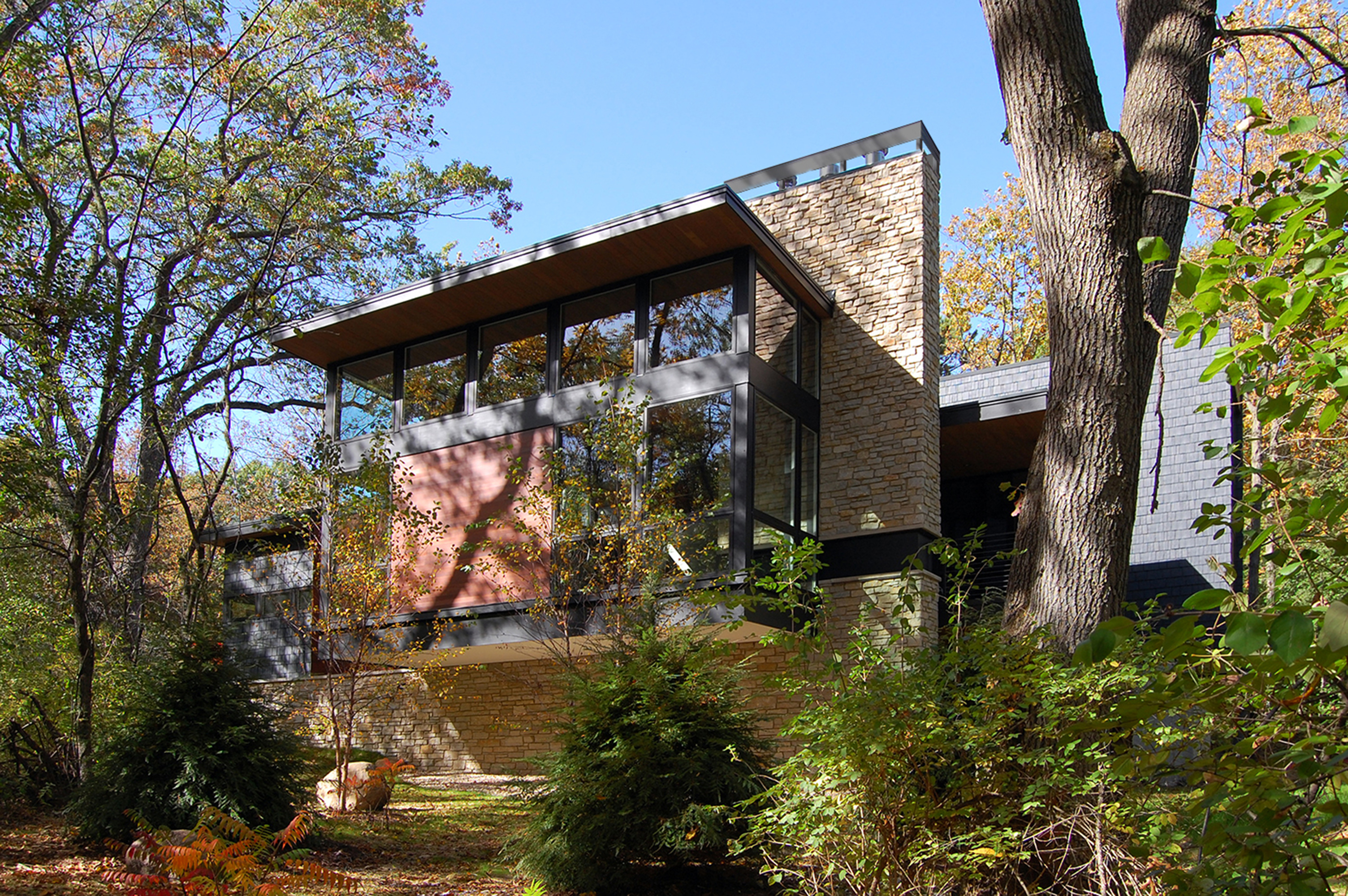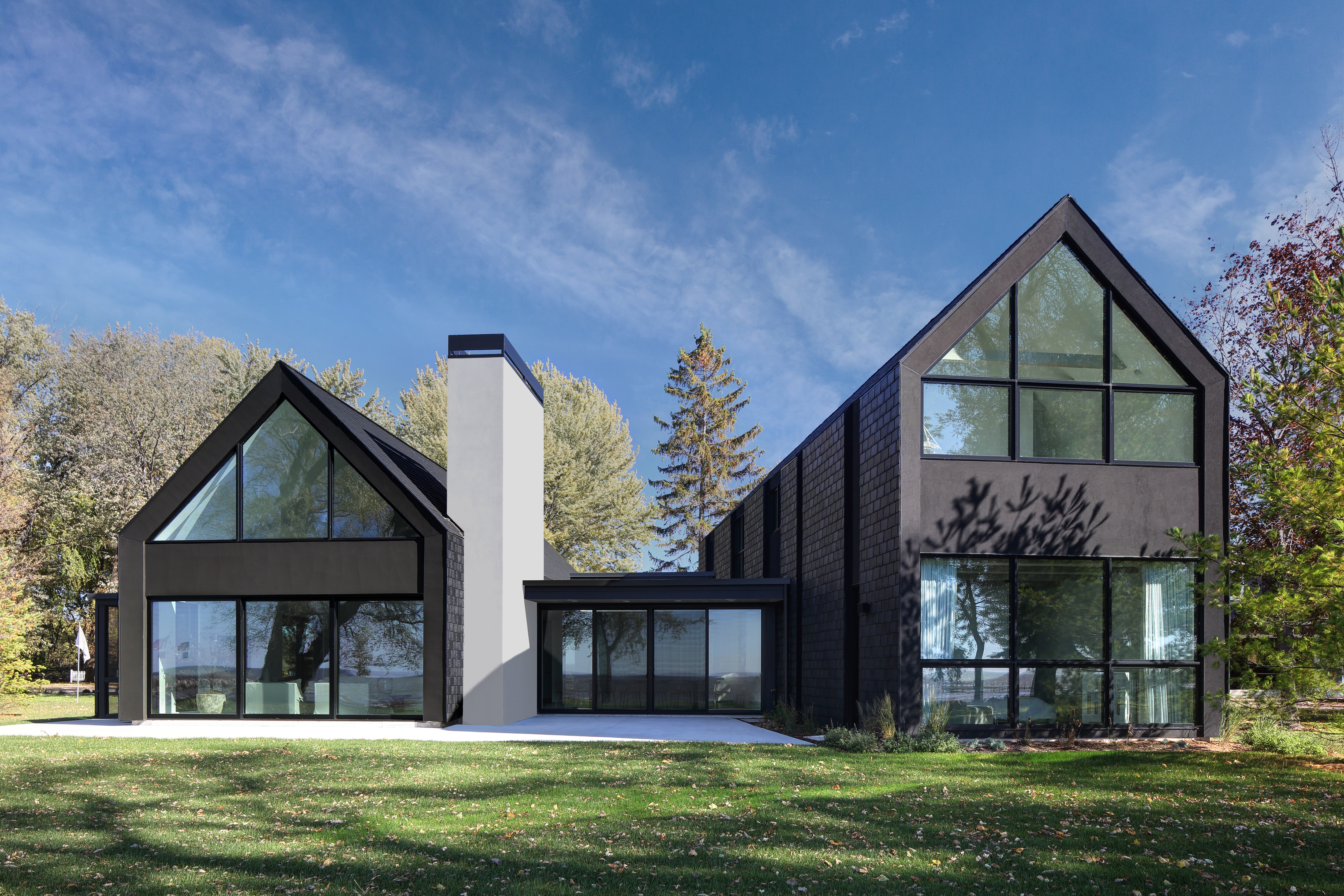 Arboretum House is a project where Bruns Architecture opted for a façade made from recycled materials, including recycled tyre rubber. They particularly valued the durability this roofing material offers when applied to vertical surfaces. In addition, the house emerges from wooded surroundings as a carefully curated array of structures that harmonise to form an architectural ecosystem. Nestled within the rich tapestry of the University of Wisconsin Arboretum neighborhood, the primary aim of the design was to craft a home that seamlessly integrates with the lush vegetation while leaving minimal footprint on the existing landscape.