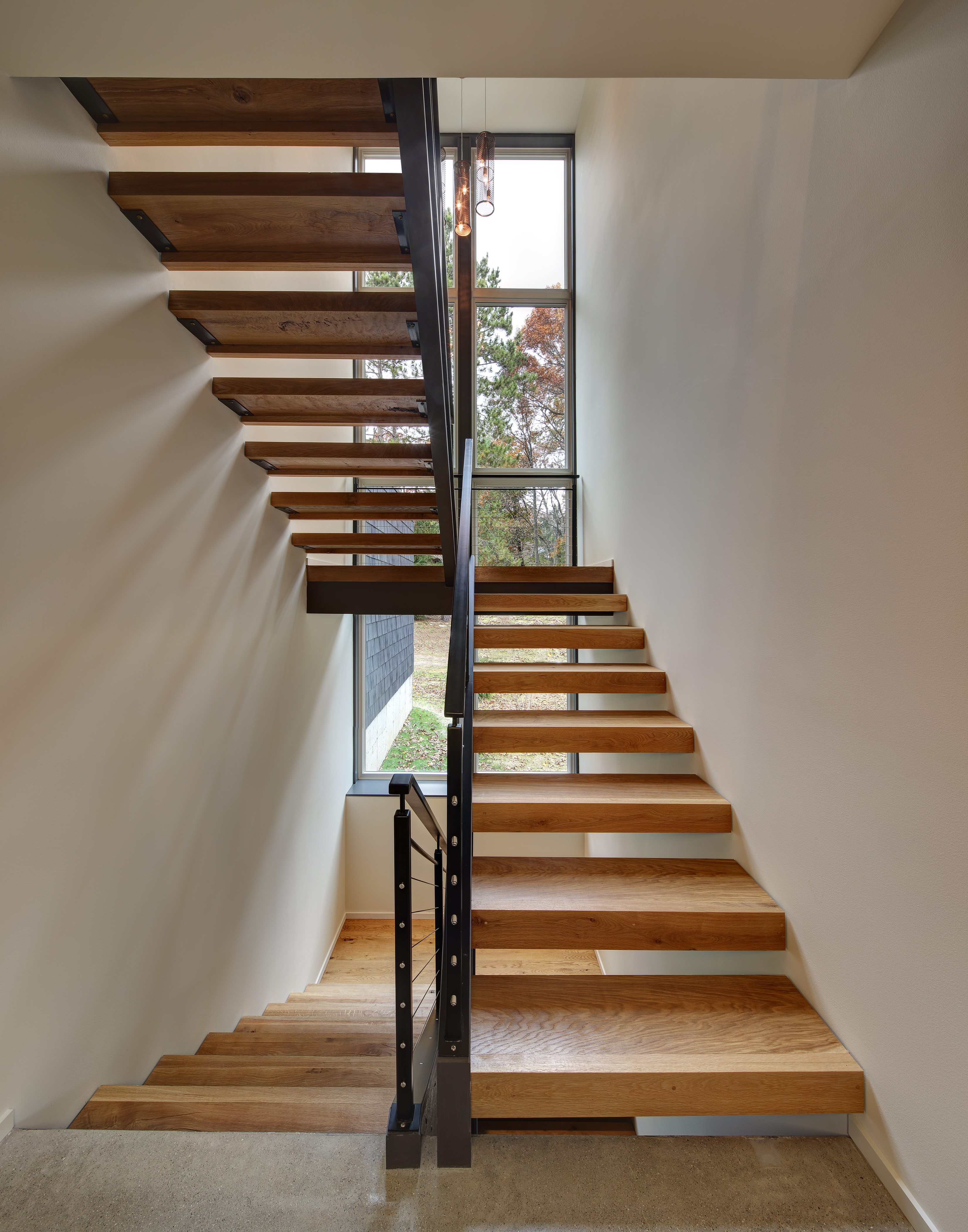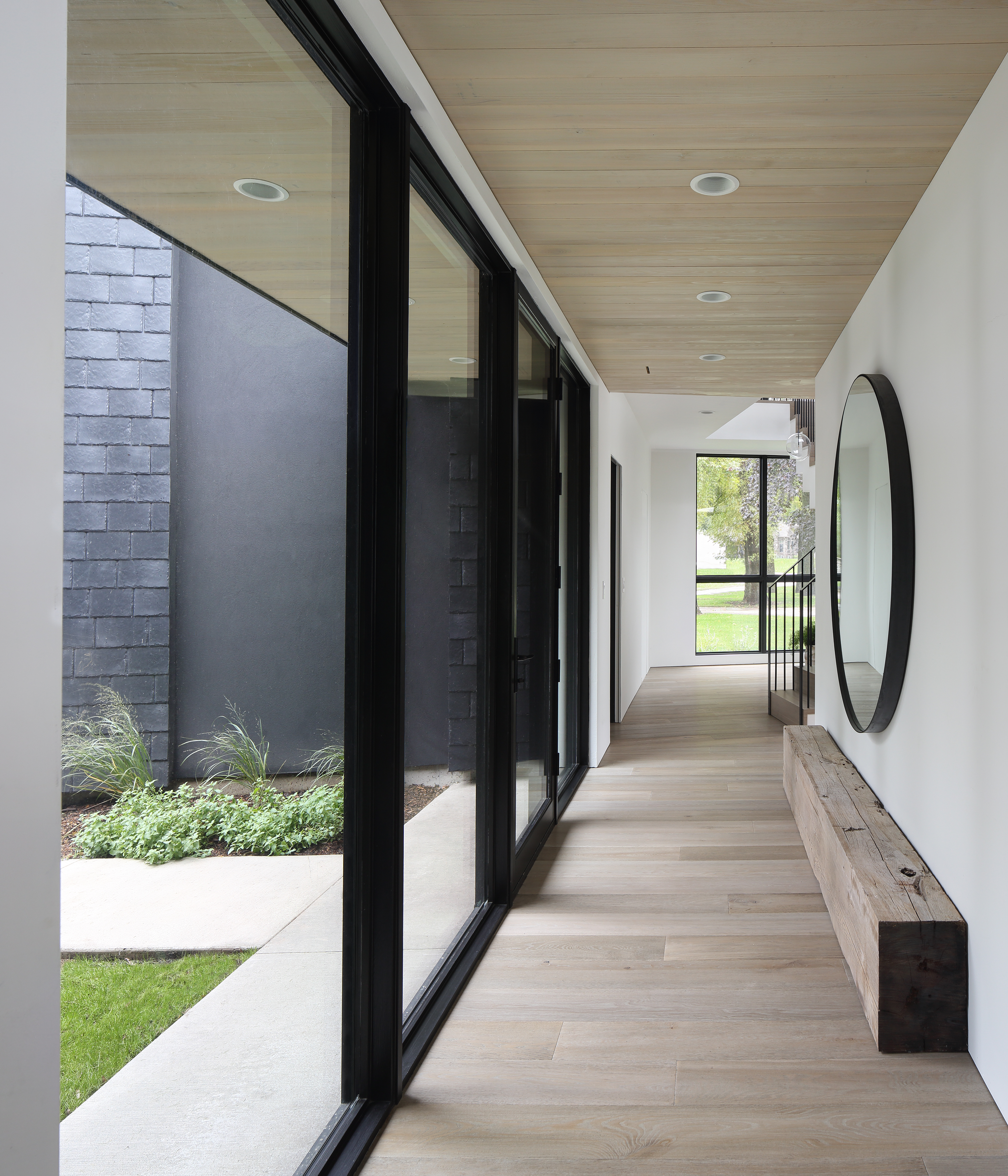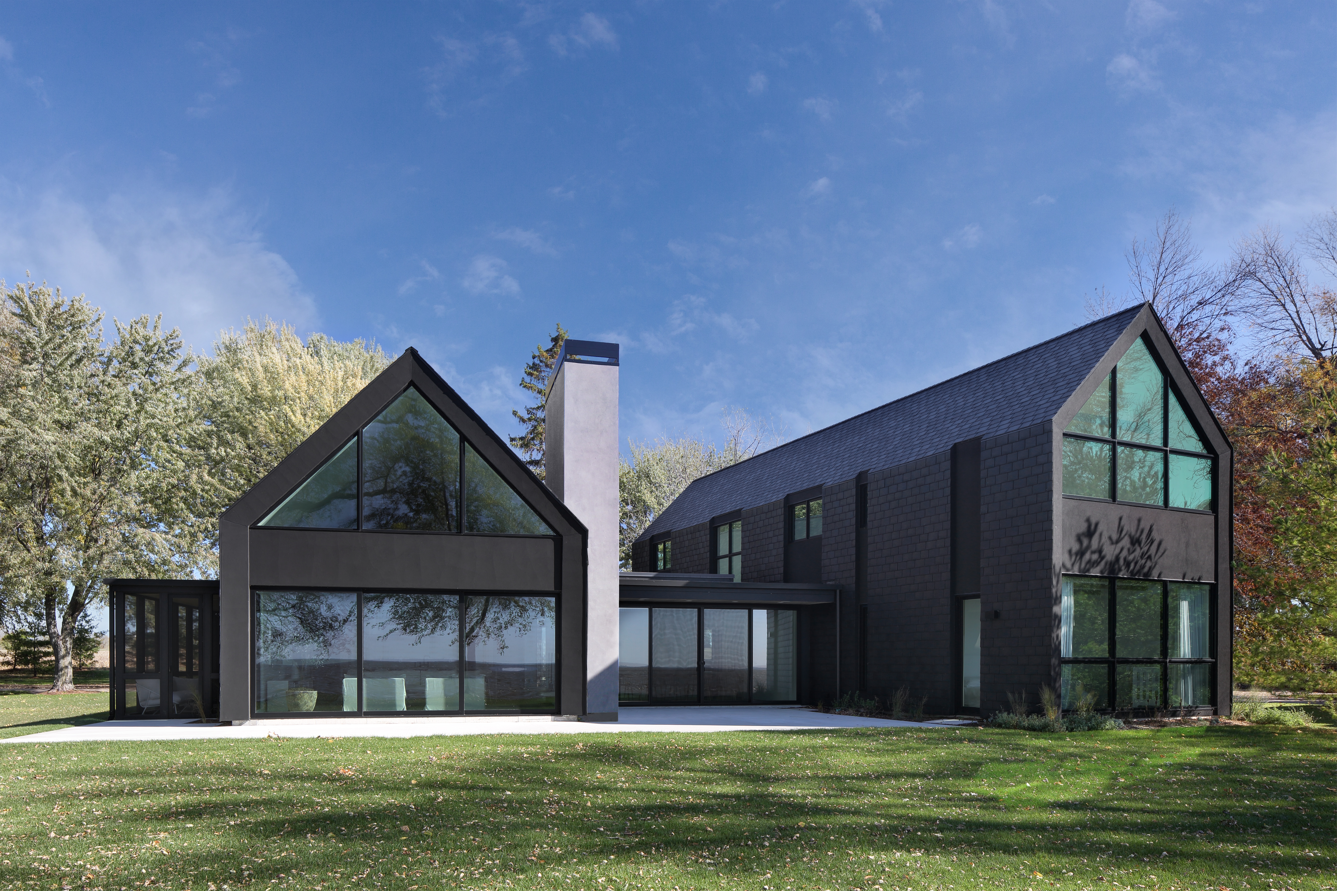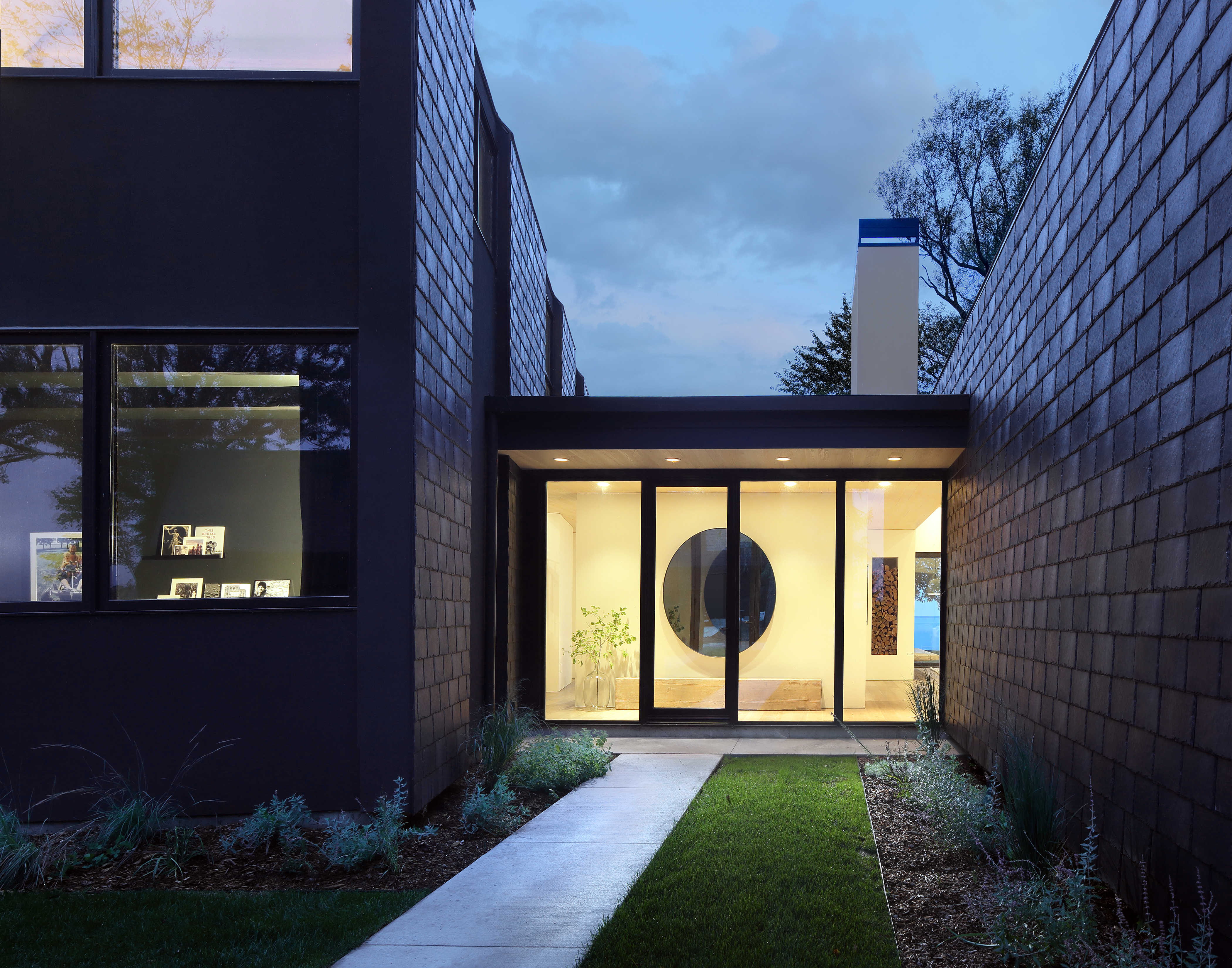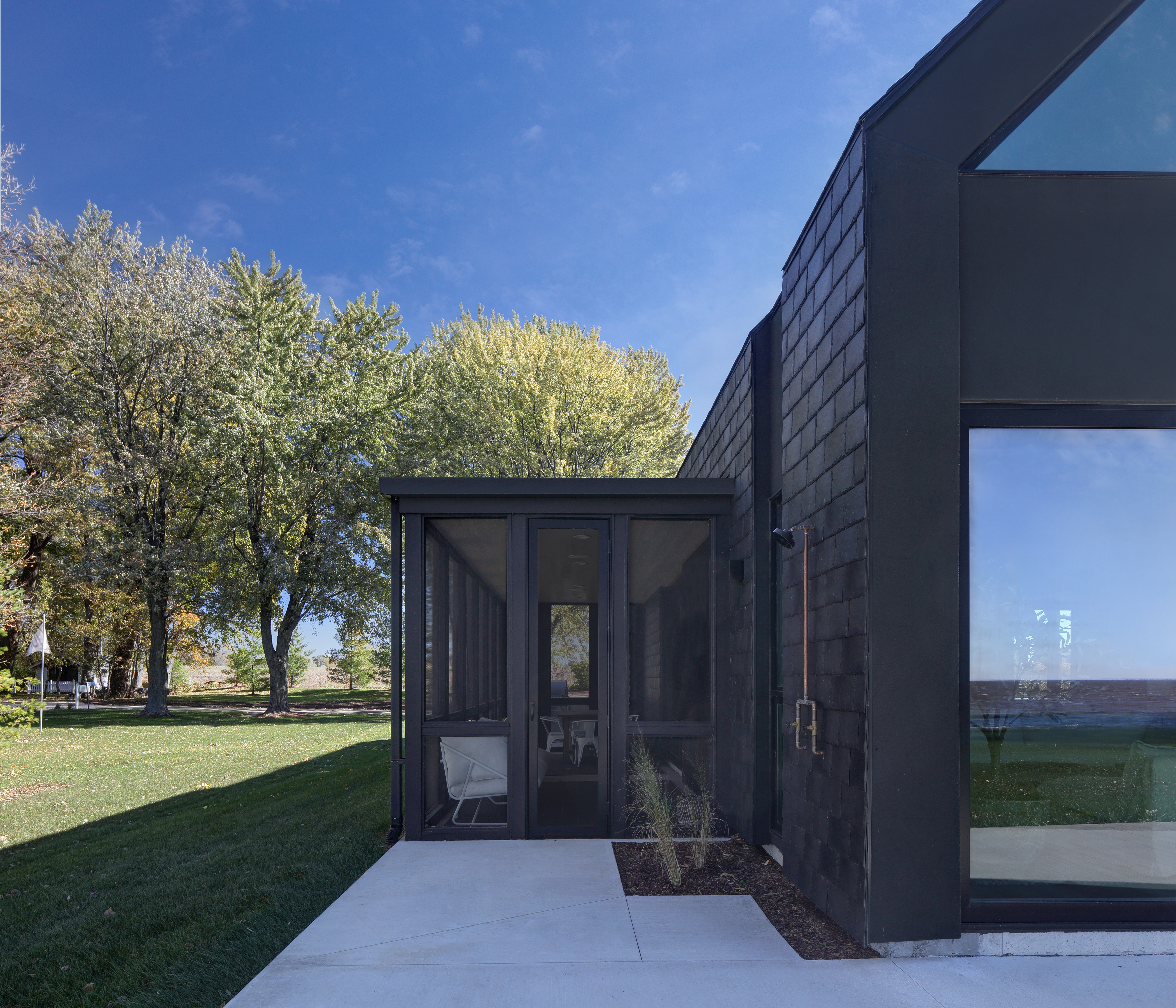 Woven House is another project by Bruns Architecture that incorporates recycled materials, including recycled tyre rubber, for the façade. The exterior, clad in synthetic slate tiles made from recycled tyres, creates a striking mosaic-like finish over the building’s bold, outlined forms. This sleek exterior feature intricate incisions at window and door openings, revealing a layered covering that envelops and protects the interior space. The house captures the essence of a home, highlighting the core elements of traditional residential design while embracing contemporary living. Located on the eastern shores of Lake Winnebago, this striking structure serves as a welcoming sanctuary, blending refined elegance with its natural surroundings to create a seamless connection to the outdoors.