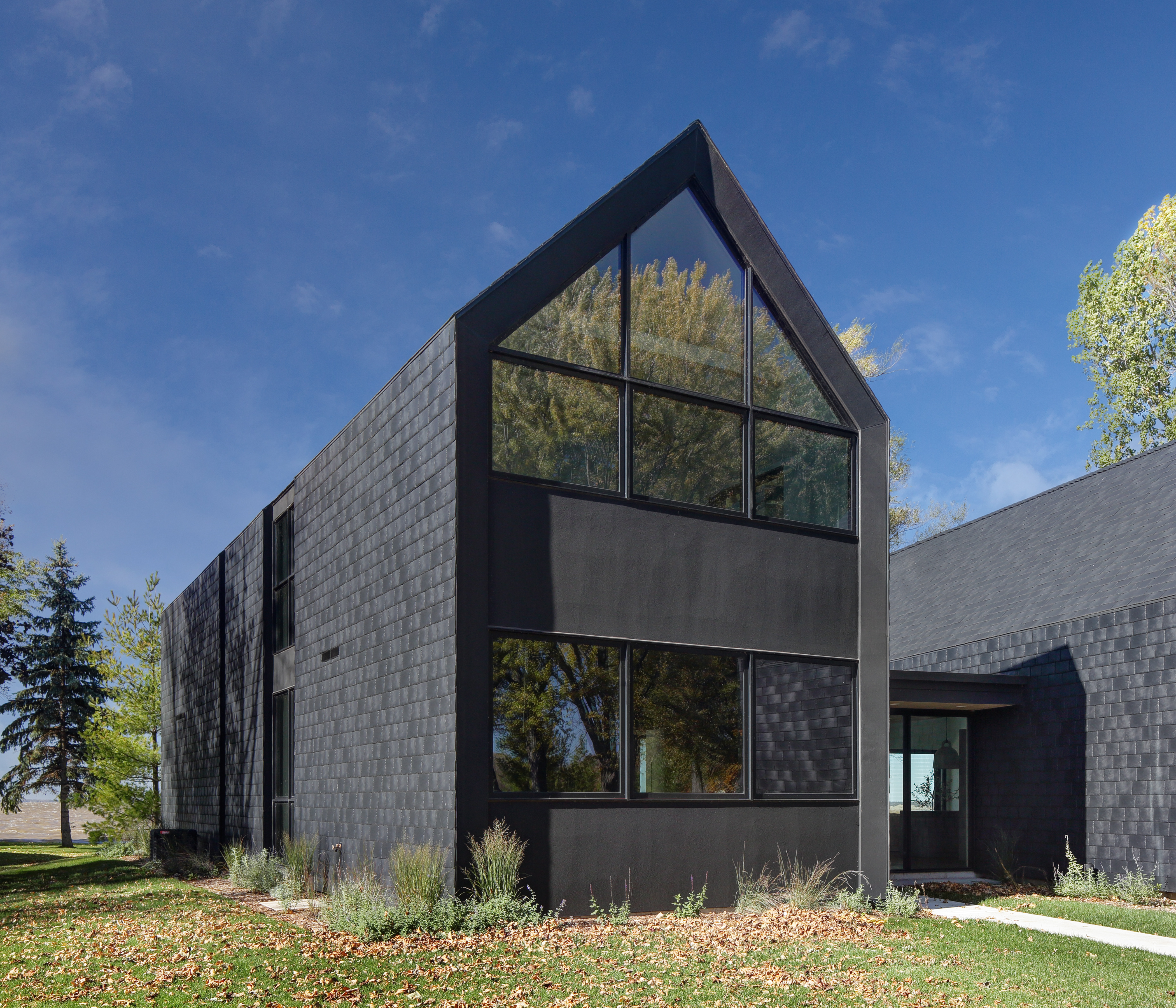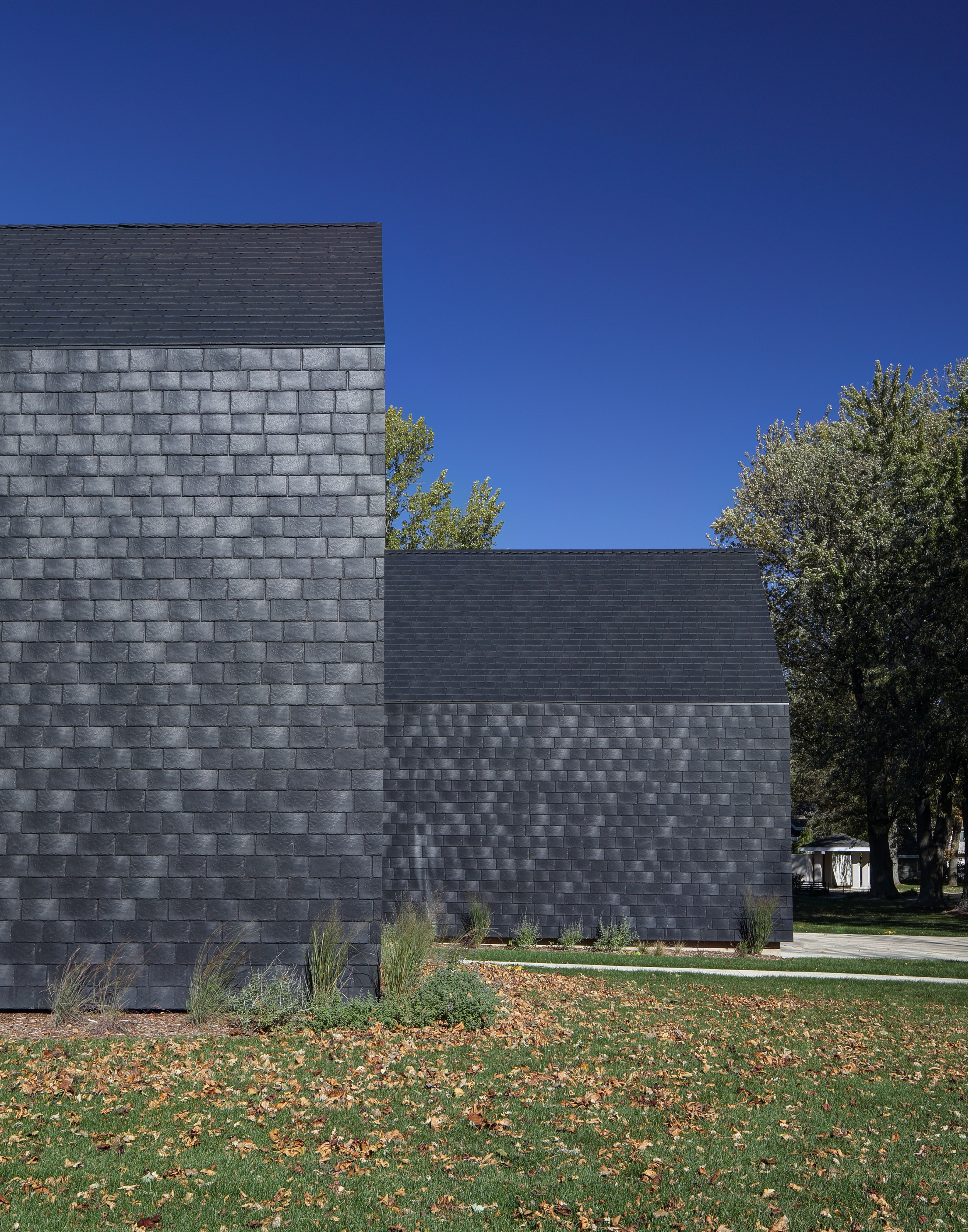 Stephen Bruns founded Bruns Architecture in 2008 with a singular aim: to create pure, meaningful designs that manifest as meticulously crafted structures. Through attentive listening, rigorous research, cultivating strong relationships, and embracing innovative thinking, Bruns Architecture endeavours to enhance their spatial environments, delivering considerate, sustainable, and enduring architecture. When Bruns Architecture discovered roofing products made from recycled materials, including recycled tyre rubber, one aspect that particularly caught their attention was the texture of the material, especially in a tiled application, along with its durability and the thoughtful reuse of resources. Although designed as a roofing product, Bruns Architecture used it innovatively on the façade. The way light reflects off the otherwise black surface creates a silvery sheen, giving it a mosaic-like effect.