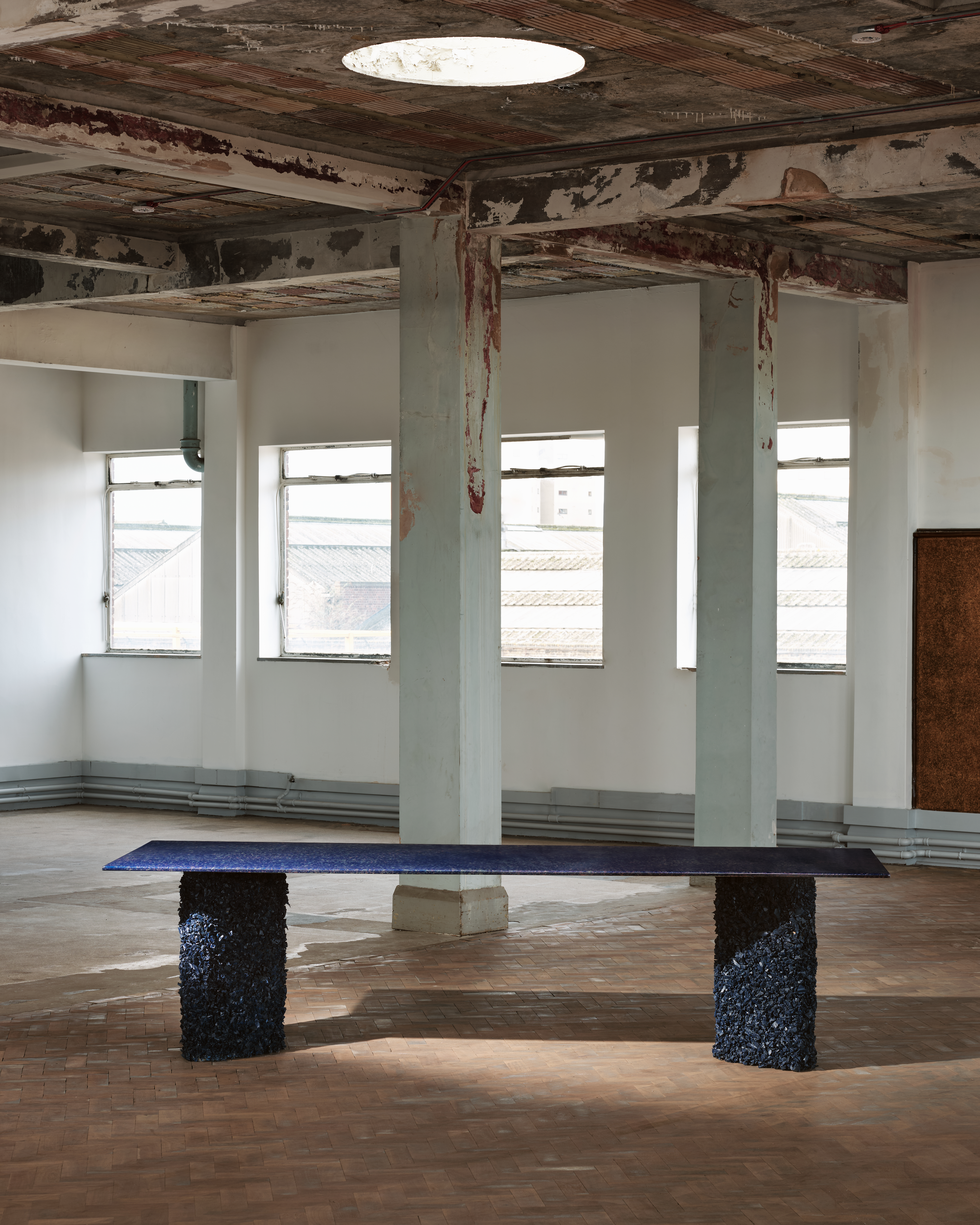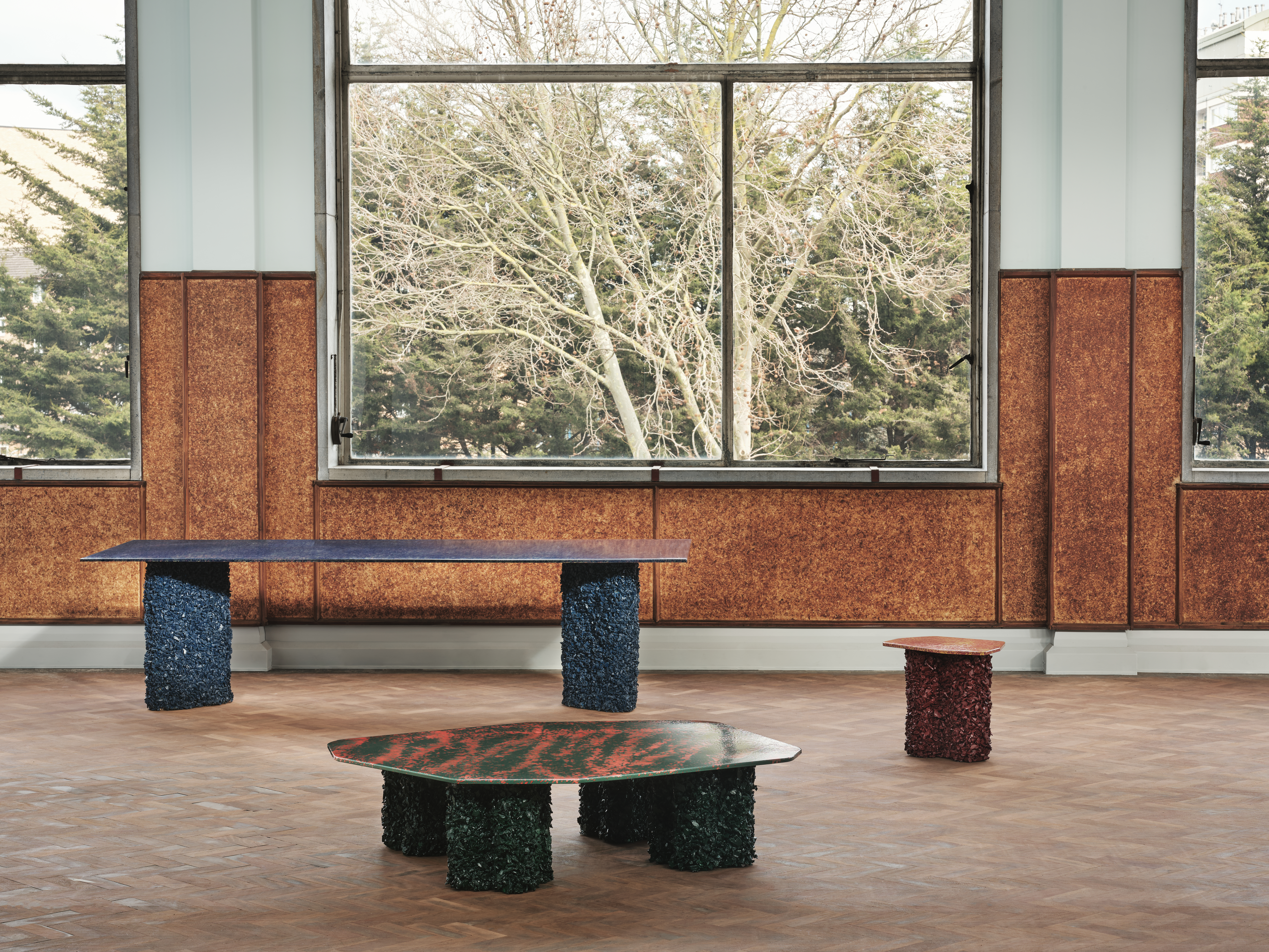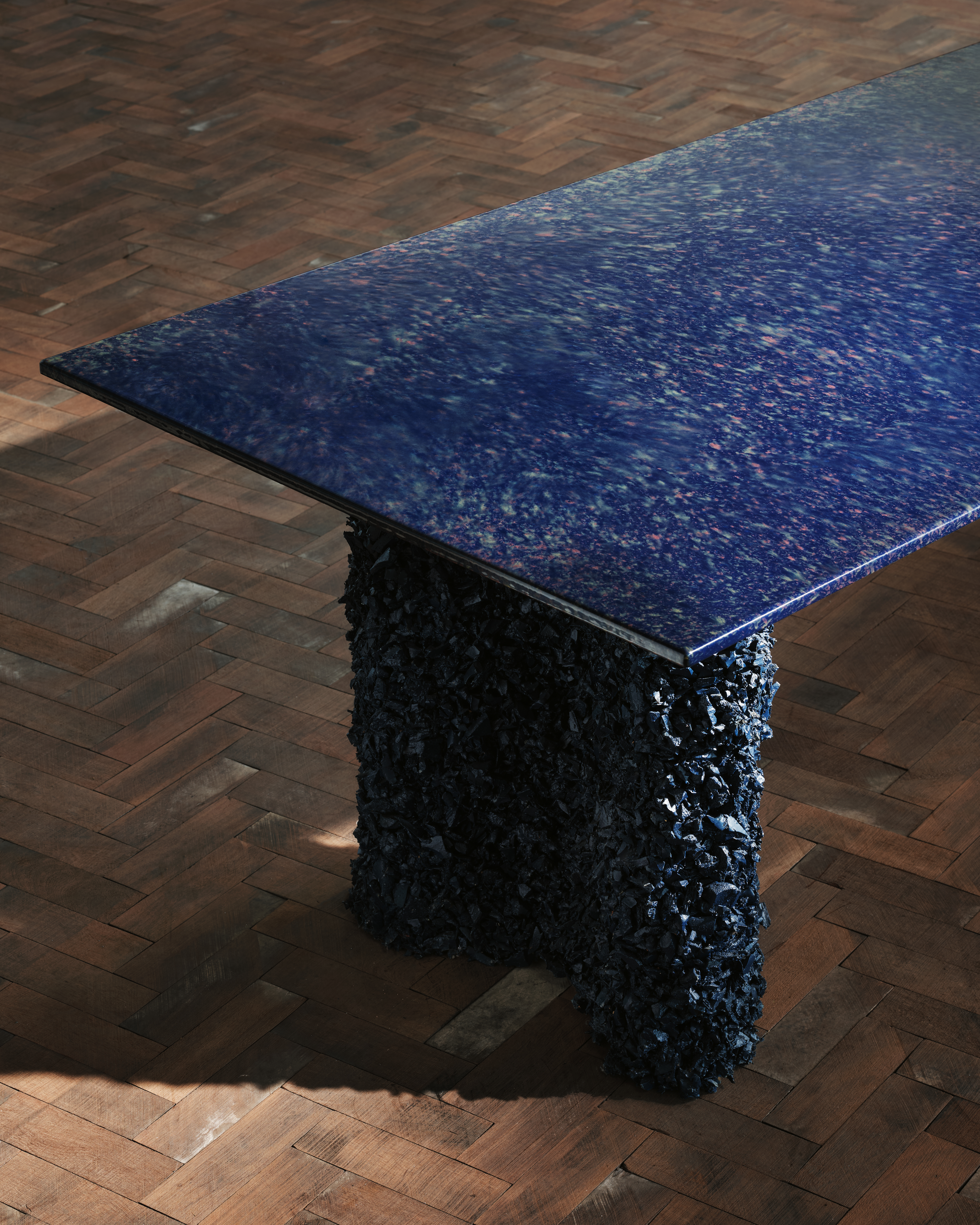 London-based architecture studio CAN stands behind the creation of Liquid Geology, a collection of tables that continues the practice’s experimental research into innovative material use in unexpected contexts. The series features dining, coffee, and side tables characterised by chunky, rubber-coated bases and slimline, steel-enamel tops. The steel is hand-cut and lightly bent to form a soft lip around the edge. The table tops are coated with rich blue, green, or orange enamel and fired in a kiln at 820 degrees Celsius before being hand-splattered in a contrasting tone and re-fired. The rough, craggy bases are coated in ’rubber rock,’ a unique material composition of recycled rubber chips and resin developed by CAN while researching alternative material uses in furniture production. Each base, varying in size and form, is hand-cast and coated in deep gloss paint to enhance the texture. Liquid Geology is the culmination of research into underutilised materials to create hyperreal spaces and products. The distorted scale of the super-thin steel on chunky bases hints at viewing the tables through a watery lens or as a cross-section of a mountainous lake.