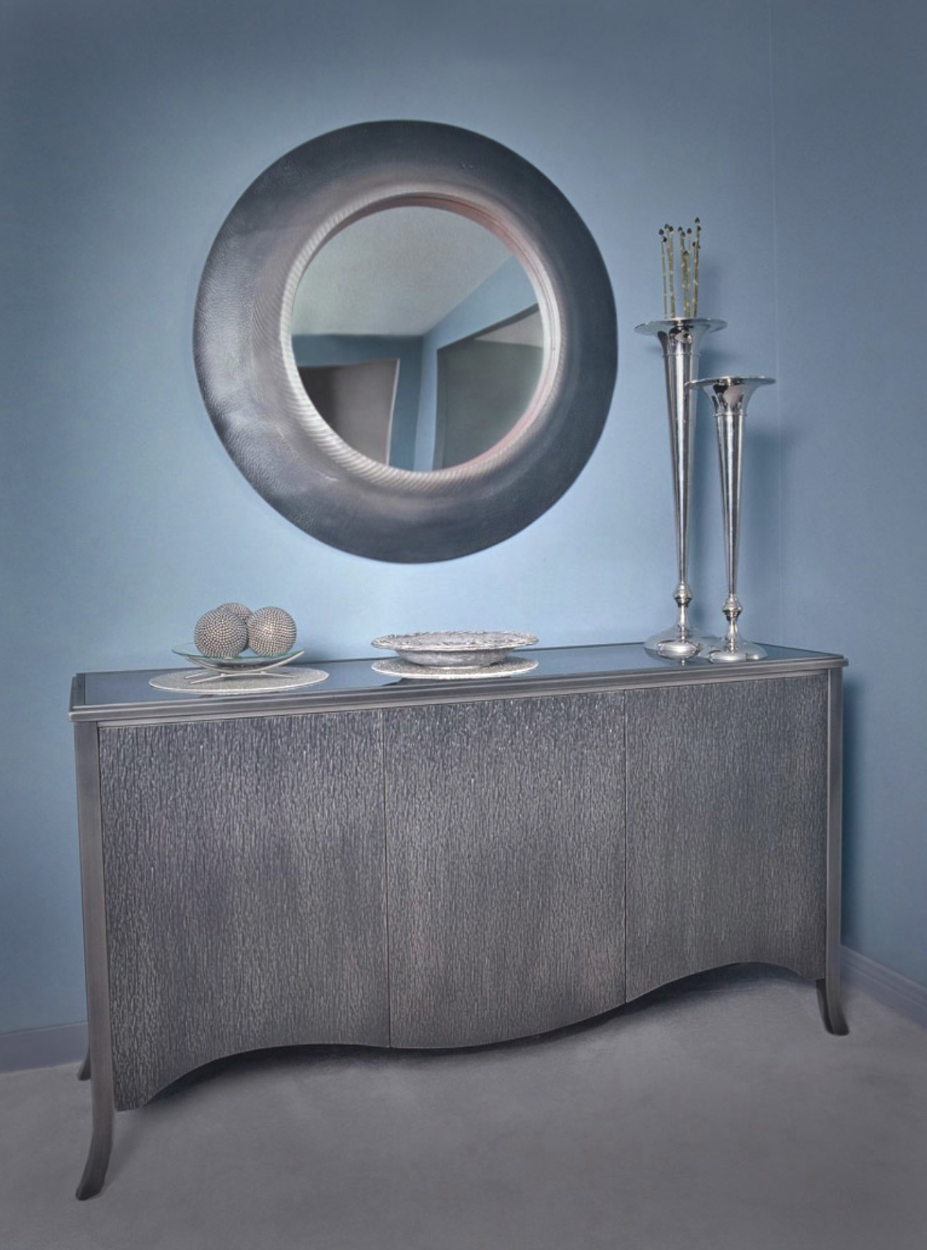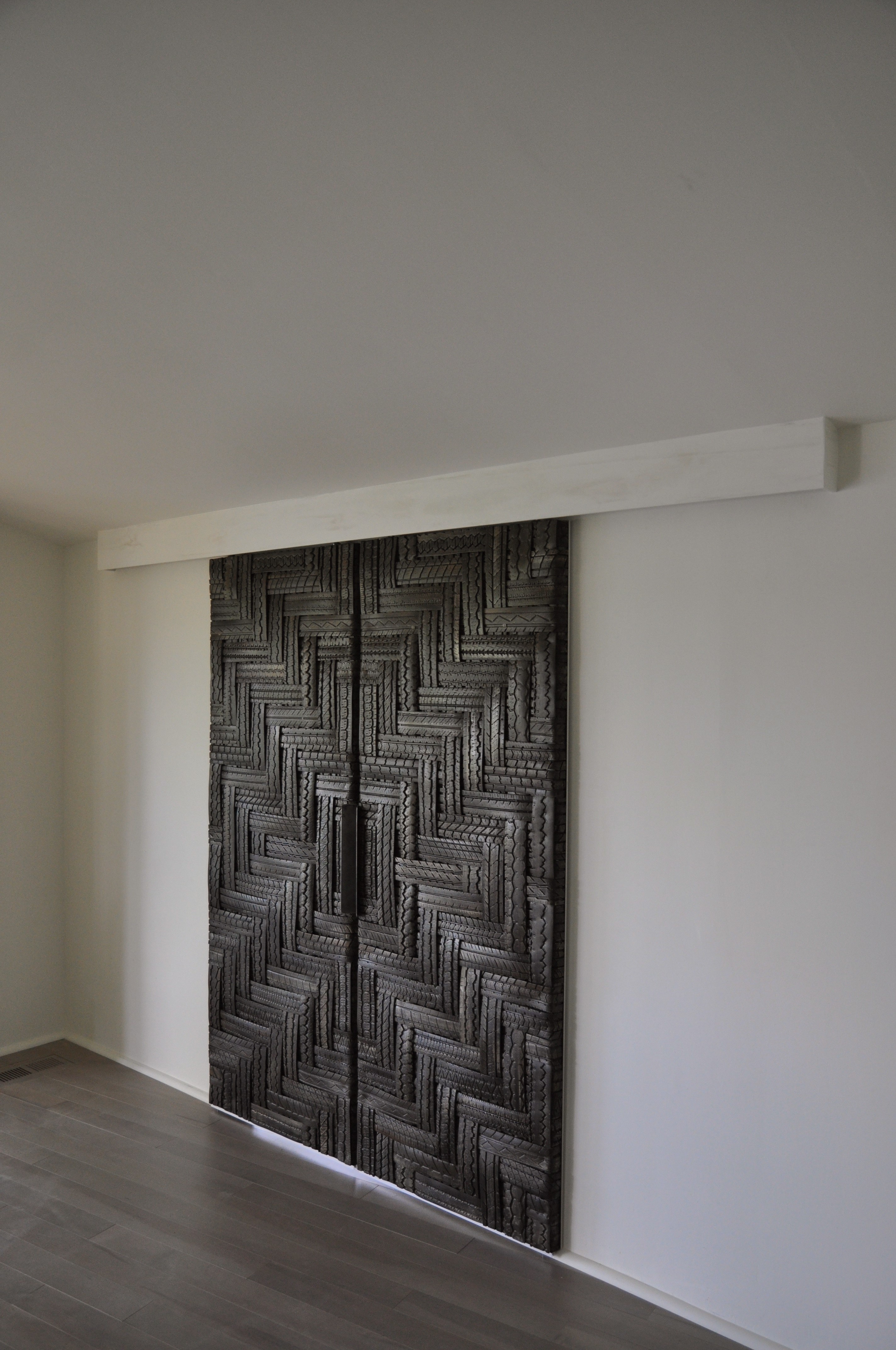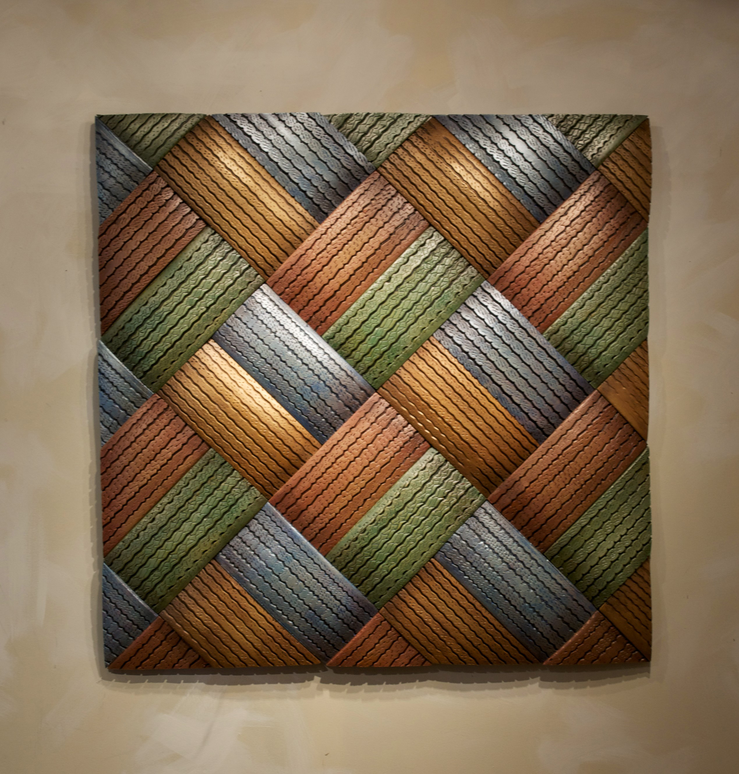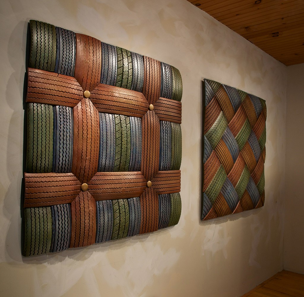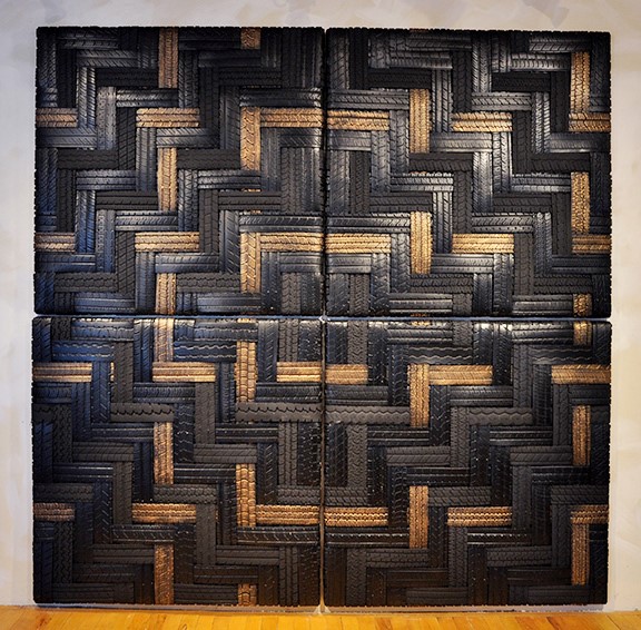 Today, Carolyn meticulously sources specific tyres from repair garages and landfills, transforming them into art and design pieces after thorough cleaning and cutting. Initially, she attempted to cut through the steel belts using a jigsaw but later discovered bias ply tyres, which utilise woven nylon instead of steel. This discovery made it easier to cut the tyres with a utility knife, while also reducing the release of caustic smoke into the air. The labour-intensive process of cutting tyres into pieces is primarily carried out by hand, with an emphasis on minimising energy consumption. Carolyn’s early years were characterised by experimentation with paints and stains that adhese to rubber surfaces. She explains that the paint coating serves a dual purpose: it encapsulates the item, reducing potential rubber odour, and gives it the appearance of leather, wood, or ceramics. Striving to incorporate as many recycled materials as possible, Carolyn utilises various car parts, used mirrors, and window frames in her designs. Paint and other hardware, such as wire, screws, and bolts, are procured new. Her designs often evoke astonishment, with many finding it hard to believe they are crafted from used tyres. While the aesthetic of tyres may present a challenge for some, Carolyn views her designs as a harbinger of a future where manufacturing with waste products becomes commonplace.