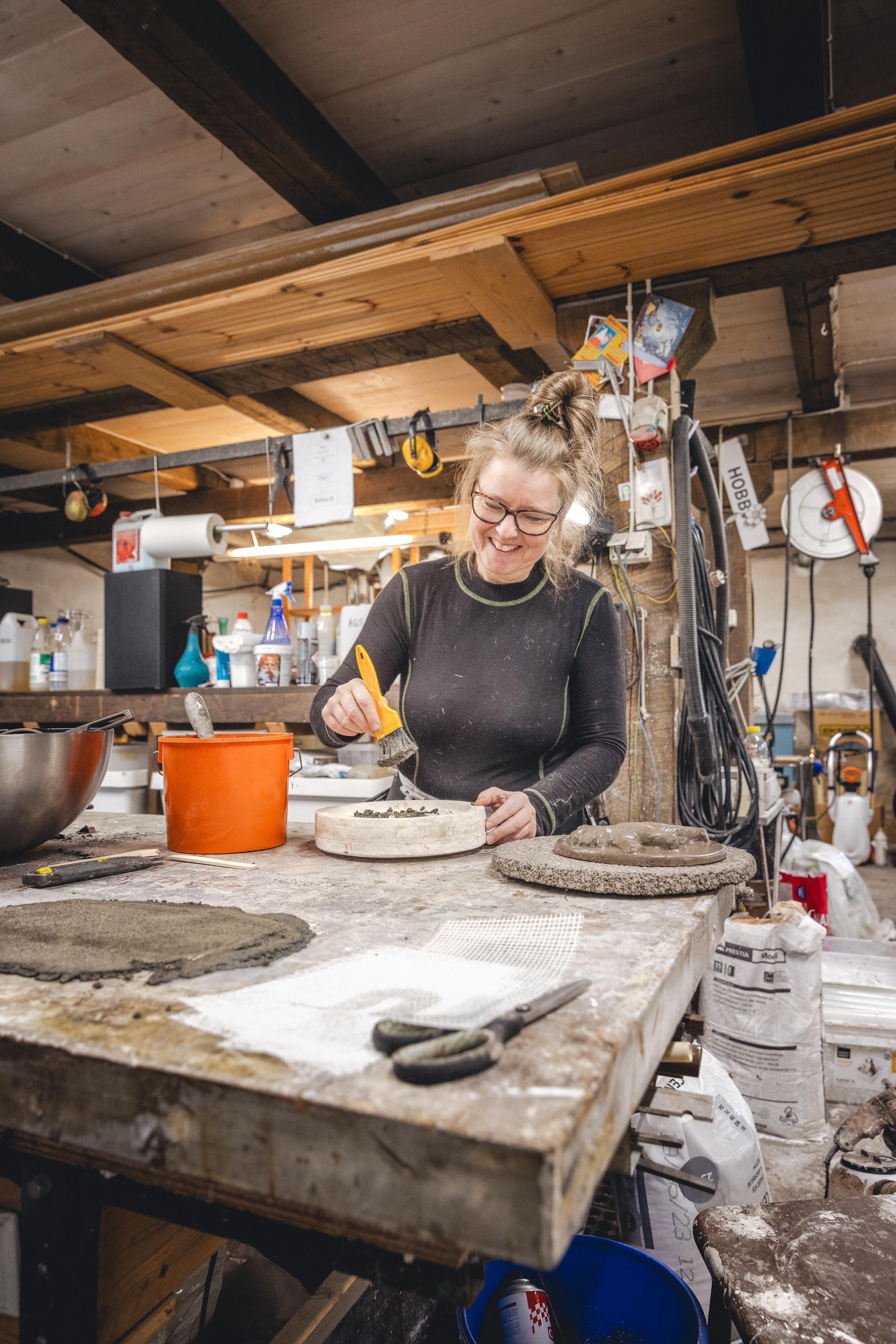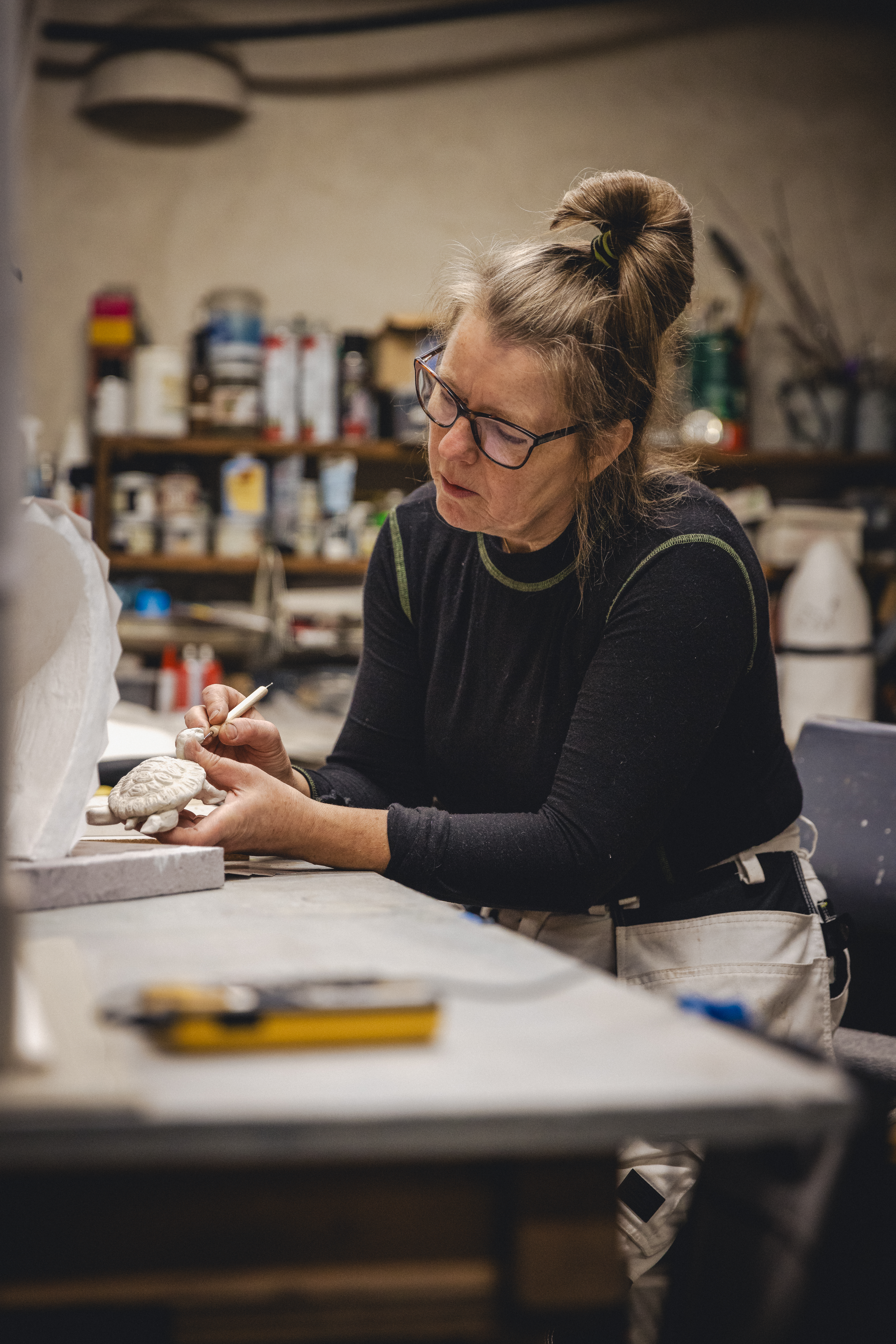 Ann-Charlott Fornhed, a trained sculptor, has created commissioned works across Sweden, bringing art to schools, hospitals, residential areas, and public spaces. Known for her downto-earth approach and storytelling flair, she finds inspiration in the animal kingdom, the human body, and the materials she works with. Her pieces carry traces of myths, fables, and dreams, and in recent years, she has explored themes surrounding women’s archetypes and roles in society. In her public commissions, the site, its history, and the people who will live alongside the artwork play vital roles. She frequently collaborates closely with clients, users, and architects, presenting her proposals with detailed models and digital montages that situate her designs within their intended settings. From small figurines to large, enduring structures that can withstand Nordic weather, Ann-Charlott tailors materials to suit each project’s requirements. Her favourites include high-strength fibre-reinforced concrete, bronze and aluminium castings, mosaics, sand-cast glass, and raku. Craftsmanship remains at the heart of her work, and she handles as much of the process as possible herself.