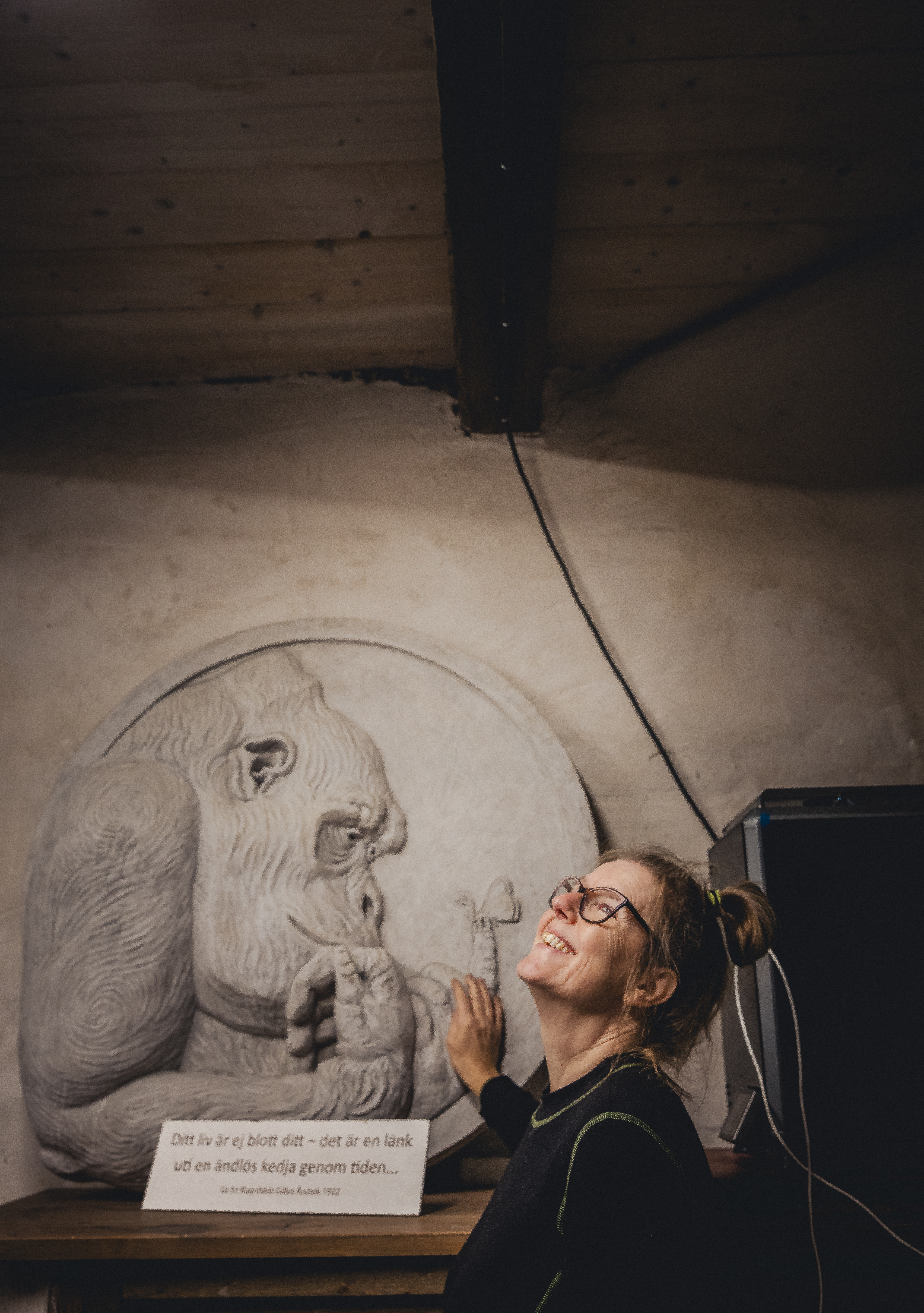 The gorilla and the butterfly embody one such encounter, together illustrating both differences and similarities: big and small, strong and weak. The gorilla, however, is endangered and thus just as vulnerable as its tiny friend. Weakness isn’t always visible on the outside. The relief was originally part of an installation at Björkhagen School in Söderköping, placed above the lift in the entrance hall. Ann-Charlott is currently creating a similar piece in concrete and recycled tyre rubber.