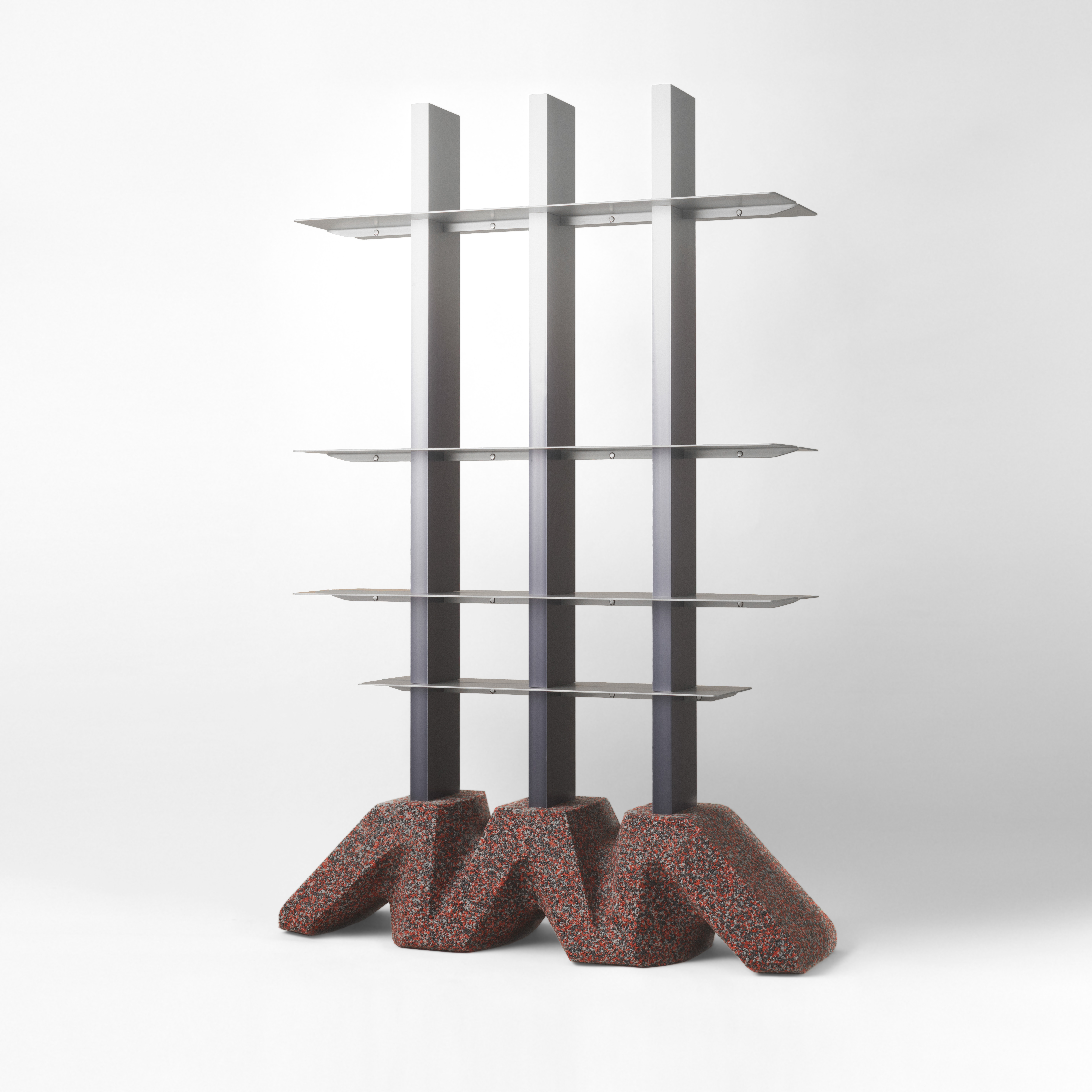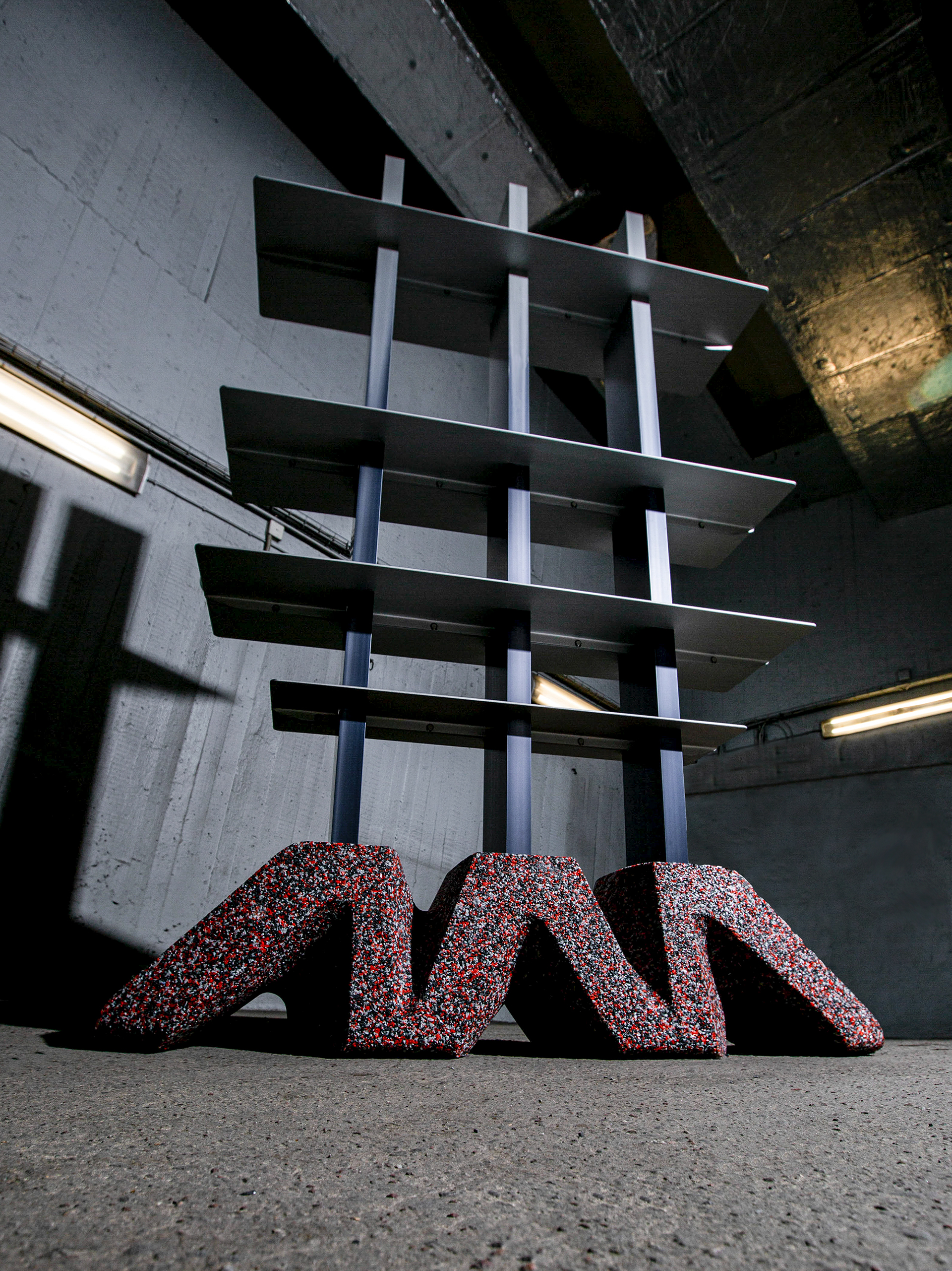 Gustav Winsth, a freelance designer based in Stockholm, is renowned for his exploration of contemporary aesthetics, often through the lens of radical design. His possessions have consistently undergone customisation. Gustav studied at the Beckmans College of Design in Stockholm. For his examination project, he created the “DIO” shelf, which resulted from an exploration of sneaker aesthetics, focusing on shapes, materials, and the underlying subcultures that form their foundation. The “DIO” shelf departs from contemporary minimalism, establishing a radically modern expression through the geometric shapes of its legs. These legs are crafted from recycled rubber granulate, while the rest of the shelf is made from anodised aluminium. Although the rubber granulate Gustav used is not derived from recycled tyre rubber, his creation can be made using granulate sourced from recycled tyre material.