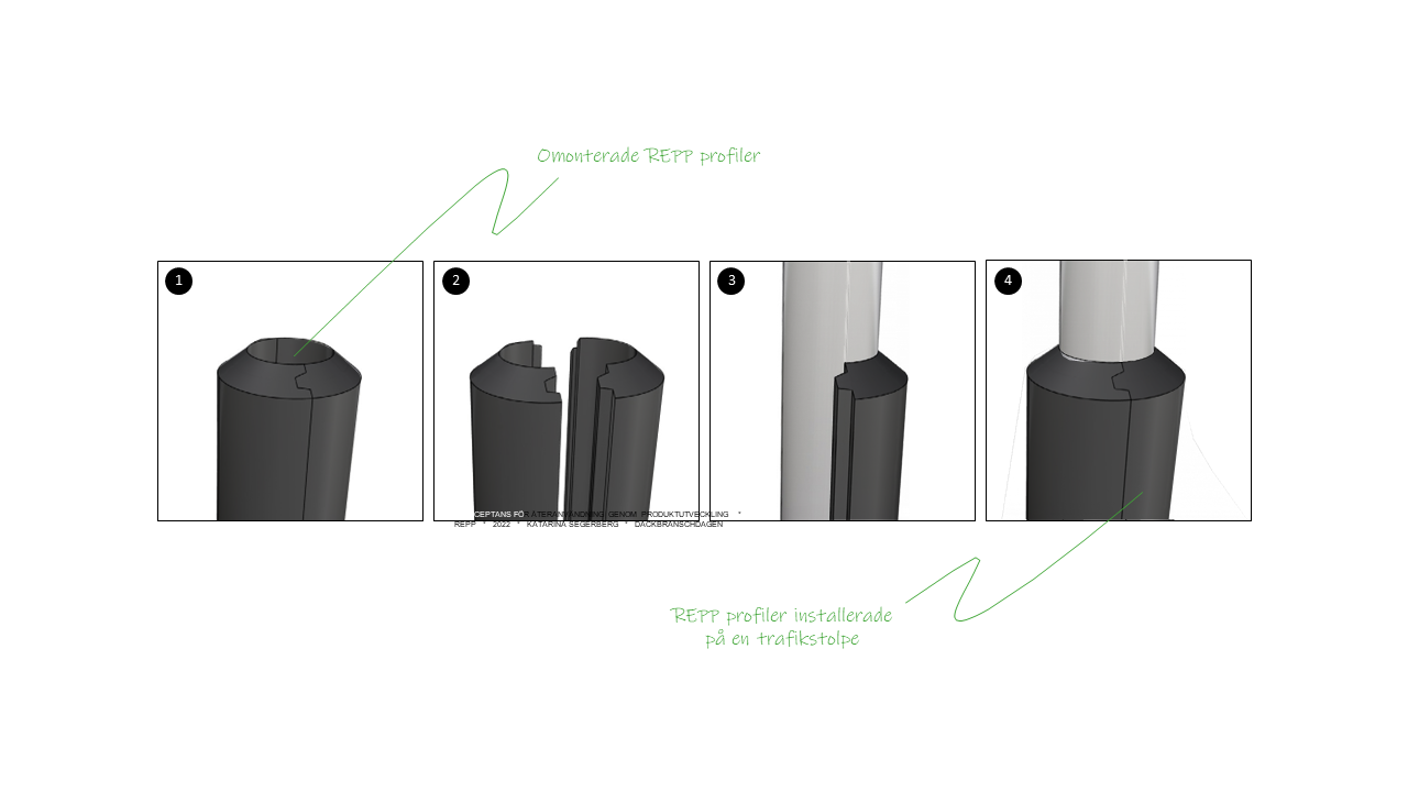 Katarina explored various attachment methods, ensuring adaptability to different post designs, and integrated reflectors and logos for improved visibility and safety. REPP profiles are secured around traffic posts by gluing two profiles along their longitudinal edges. In the event of damage, they can be disassembled and replaced using an angle grinder, ensuring both recyclability and extended use. REPP is available in different levels of softness and a range of colours, making it suitable for diverse environments, such as playgrounds or urban areas. Its standard profile size ensures compatibility with common post diameters, enhancing its practical application. Made from 100% recycled tyre rubber, REPP offers durability and resistance to environmental factors. While REPP alone won’t revolutionise the circular economy, its long-term value lies in fostering acceptance of reused materials and promoting sustainable practices in tyre recycling. Katarina Segerberg’s REPP project is a prime example of how design can drive both innovation and sustainability. By addressing the issue of tyre waste, REPP contributes to the broader circular economy, paving the way for future advancements in material reuse and environmental protection.